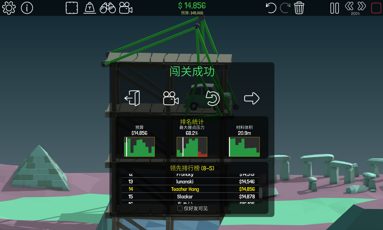 这是纯瞎播大神的,最后的操作感觉像在倒垃圾,哈哈,反正这一关都被游戏设计师逼得不像正常人了。由于他只用了很少的钢材,所以使用费用相当低,才1.7万多,用不到我的一半的费用就完成了。。。。。