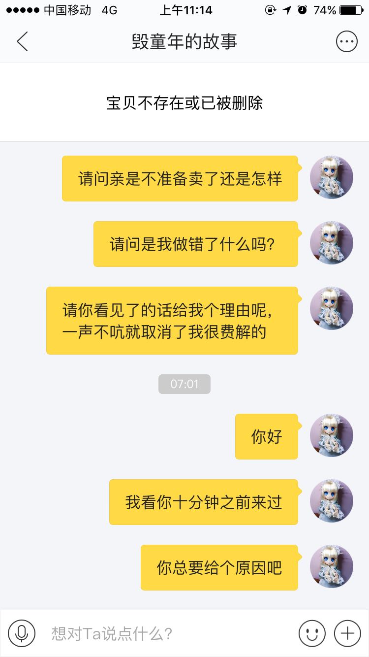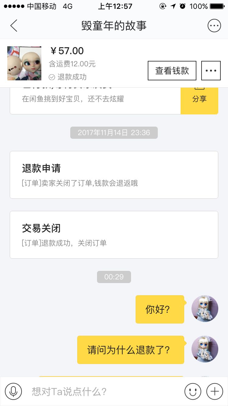 事情是这样的,昨天晚上我在闲鱼看见了卖娃头的链接,本着人穷还心痒的念头,于是就拍了这个娃头,一直很清楚娃圈这些莫名其妙的规矩,所以私聊问了这个娃的状态,卖家并不在线,怕被其他人买走,于是我就付了款等待卖家理我