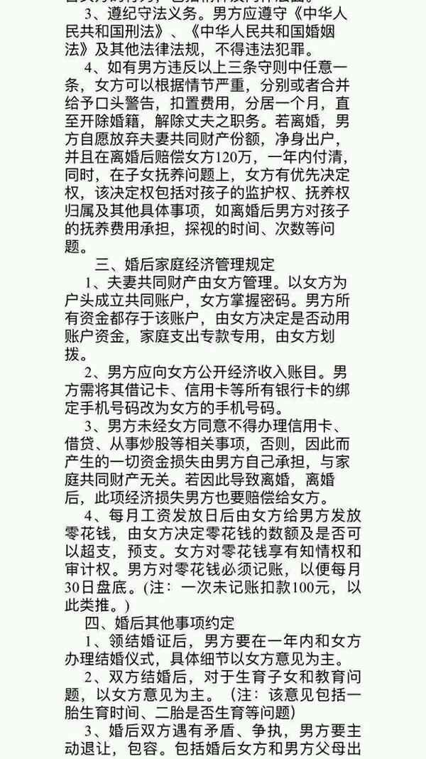 到时想离婚都得赔120万,钱是其次,关键是觉得这协议有损男人的尊严。