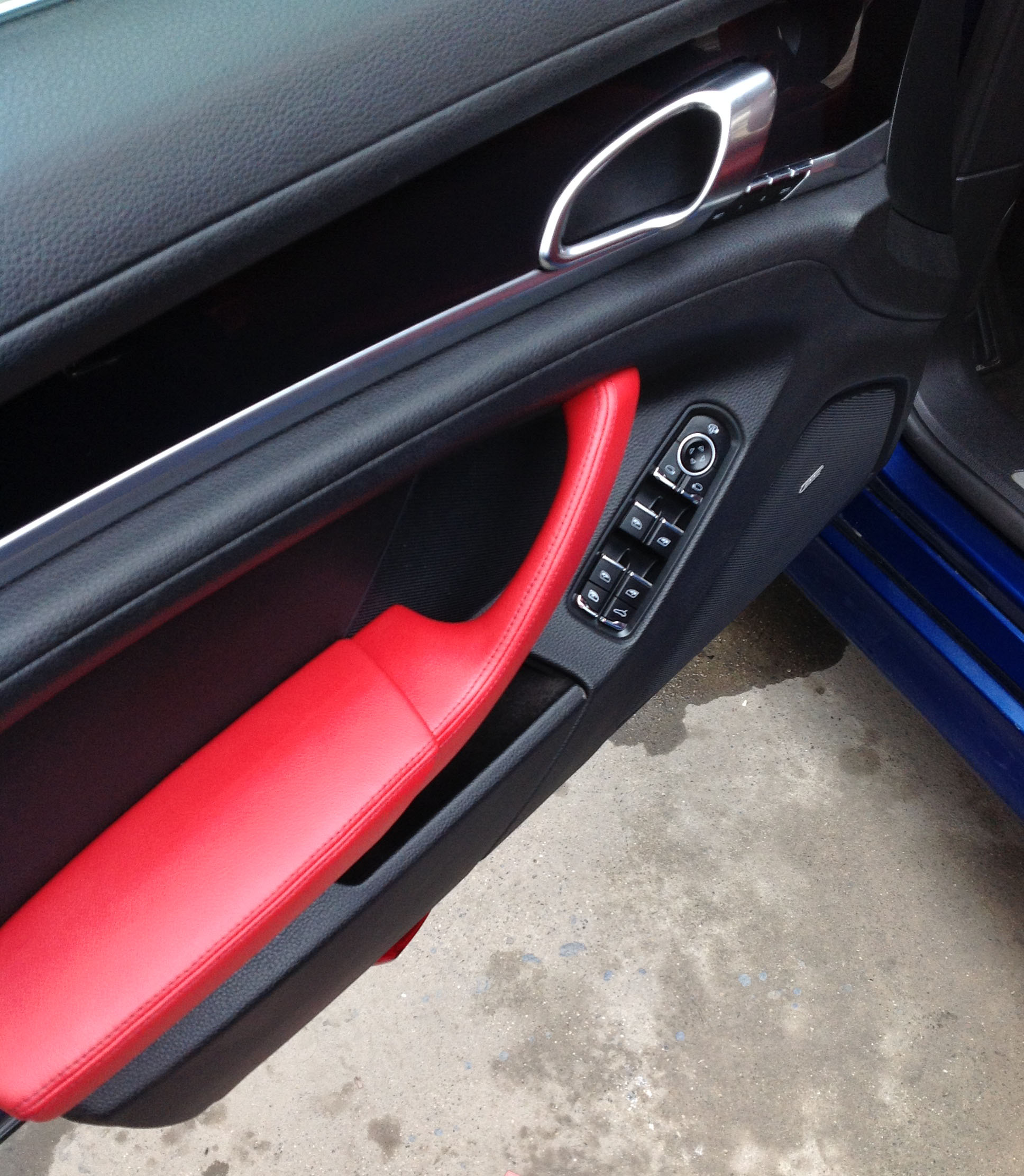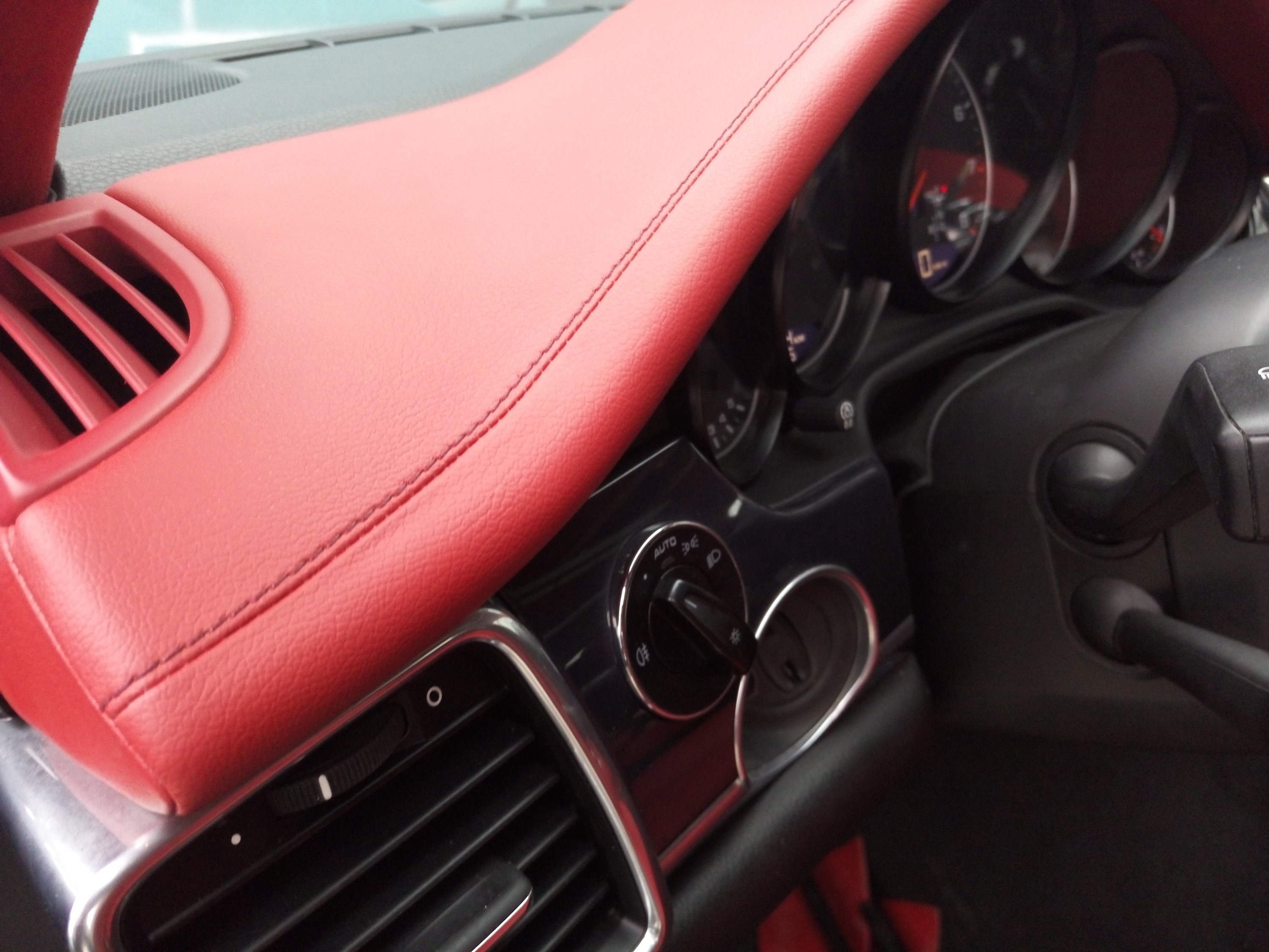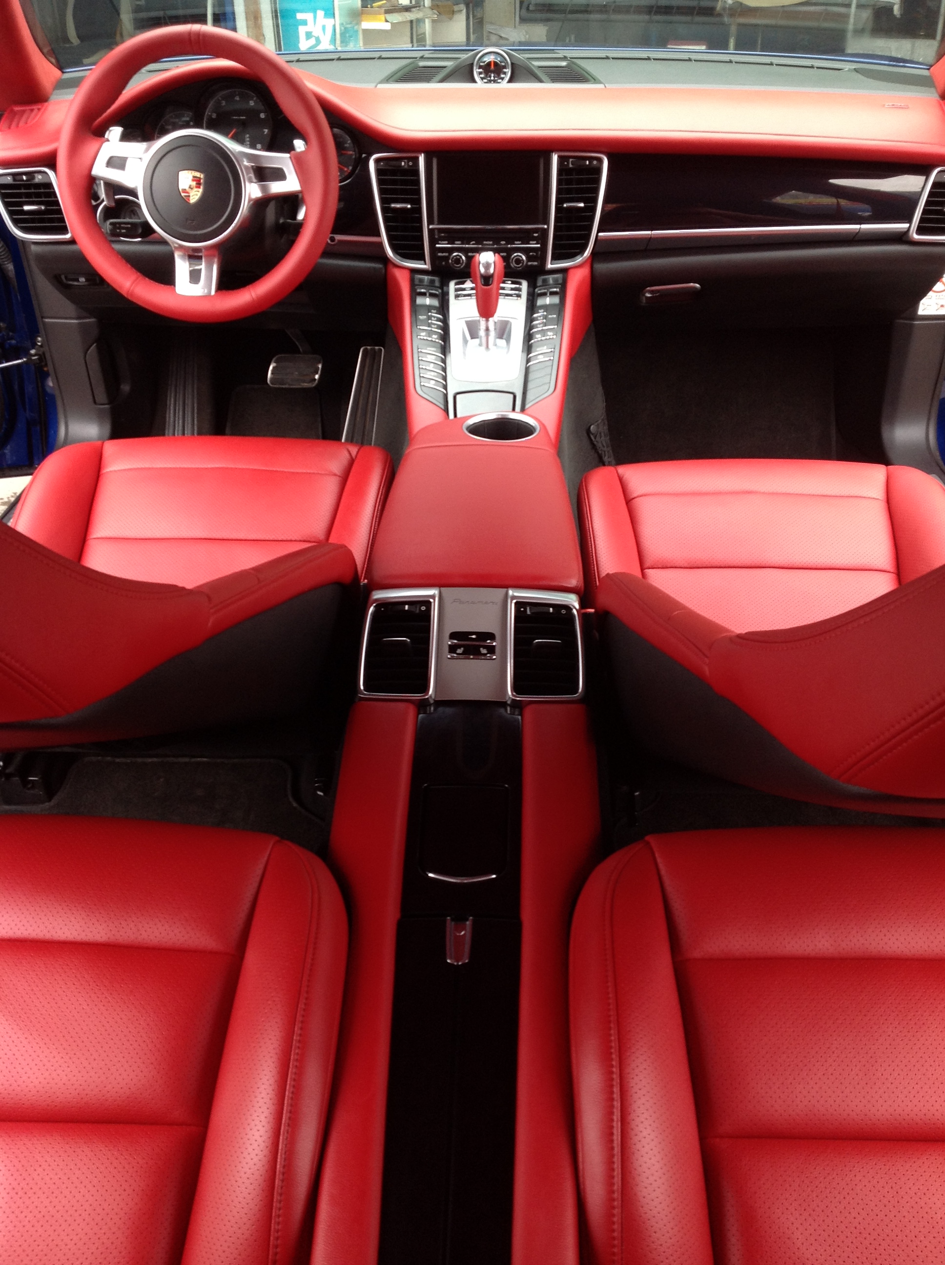 保时捷原车是黑色系,改为了红色系,仪表台、中控、扶手、挡把包红色皮,红色方向盘套、座椅、顶棚、门板,ABCD柱也包了与顶棚类似的红色。