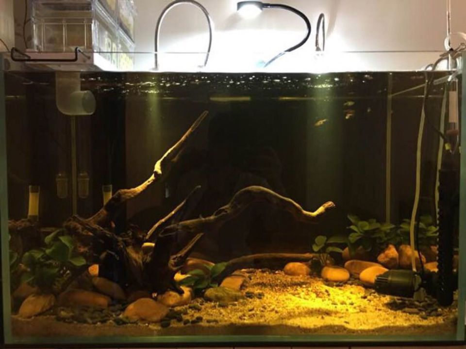 2条鱼缩在缸角不爱动弹,不知道是因为生病,还是被雪中红欺负得不敢出来。