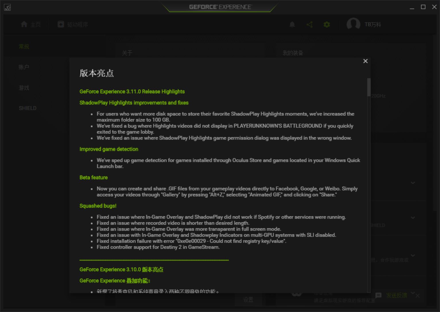 GeForce experience近日更新了新版本3.11,主要修改了对highlights的缓存空间设定,允许最大设定100G临时空间,并且新增了GIF制作分享功能。