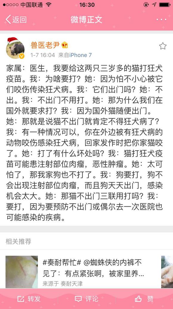 回复 我有三只喵😻 :谢谢,家里就一只猫,也不出屋,以后不打狂犬了