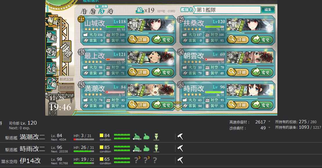 早早就认怂打乙,下午打完演习开始解谜,4点半左右完成,正式开始攻略P3双子鸡,用四村舰队走的志摩路线,目前为止只进了4次BOSS,劝退率超过90%