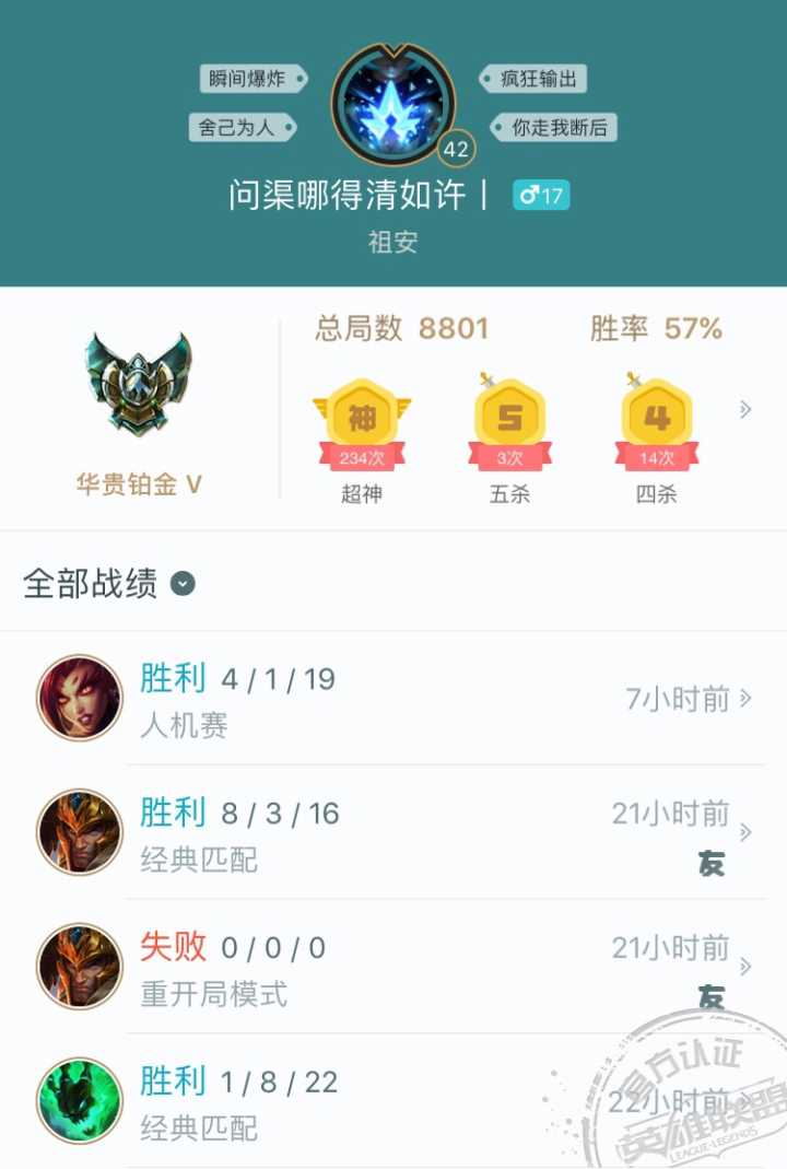 8800场老司机了,每天晚上必撸5,6把,周末稳定15把匹配, 我的ID 问渠哪得清如许丨