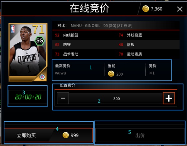 如下图所示“1”处为此物品当前竞价者的信息;“2”处可进行出价操作:通过加减来设置你的出价;“3”处为此拍买品结束拍卖的时间;“4”处可通过一口价购买此拍品,点击即可通过一口价直接购买该球员;“5”处的为出价按钮,当设置好你的价钱后即可点击此按钮进行出价;