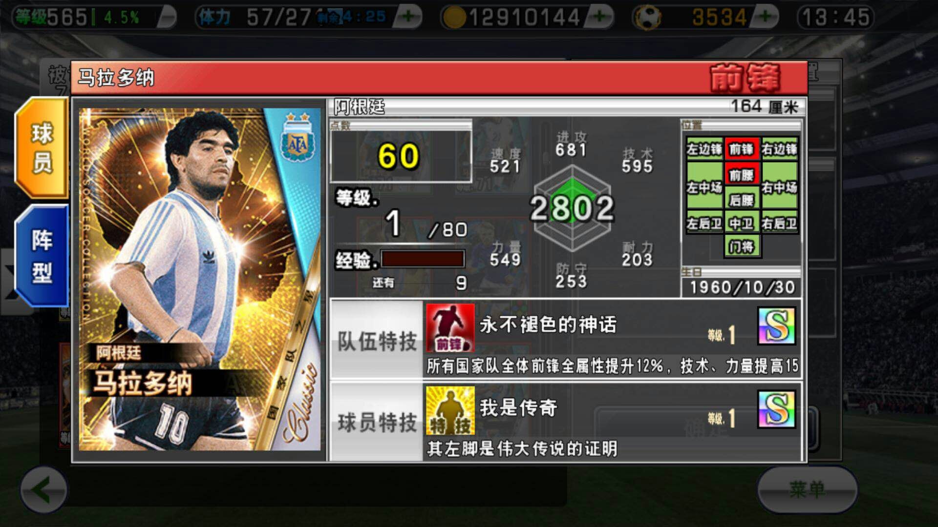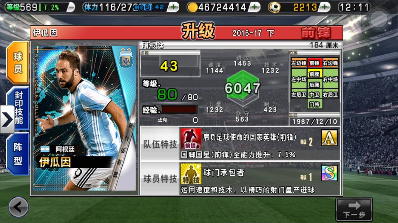 门杀+凌空。四大前锋里唯一一个没捞着远射的男人,也是唯一一个不是SS的,感觉呗组织抛弃了啊。。。多次大赛软脚表现被球迷诟病,但是可乐妹还是强行加了43C,耐力只有423,还是这么妖。这个属性我就不说什么了,MAX的话进攻能到1700,力量技术能到1450左右,速度也有1350左右,还是很逆天的,没错,这么逆天在阿根廷只能排4号位,我F。。佛慈悲。