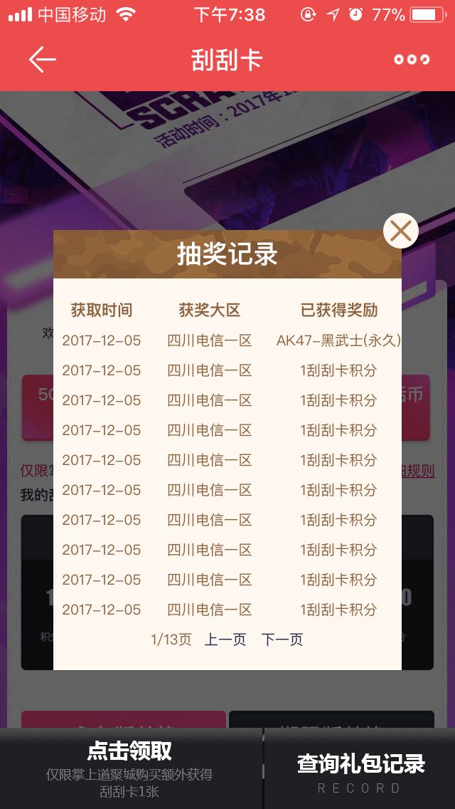 513块,119次,正好186分,一次没刮到武器,没刮到过10分或者以上的,刮到三四次5分,最后积分硬怼两把枪。最后8分是单买单抽,全是1积分。这就是12月刮刮卡真实概率,水有点深,要出手的千万慎重,强烈建议试水就好。