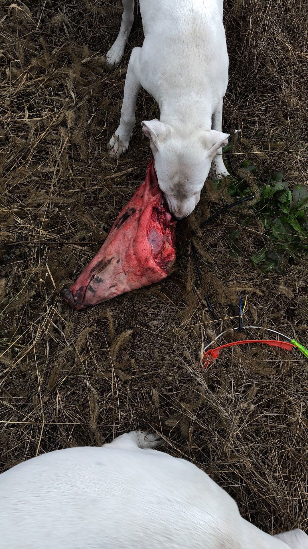 野猪头,早上才烫毛的,上面都是血,顺手给小狗熟悉气味