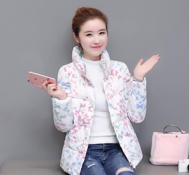 2017蝴蝶印花短款羽绒样式十分的百搭,穿起来生动有朝气,很好的润饰了身段,