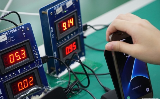 出厂前的真机实测,从图上可见是一台三星的无线充手机。这一个环节用于排除无线充的兼容性,确保抵达用户手上的无线充产品能跟原装充电器同等的性能体验。