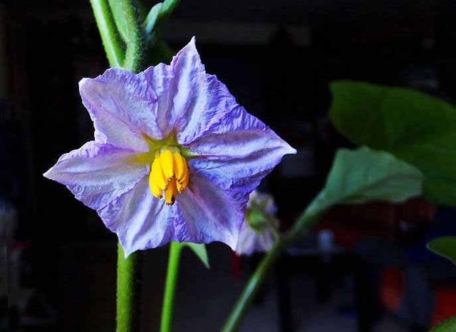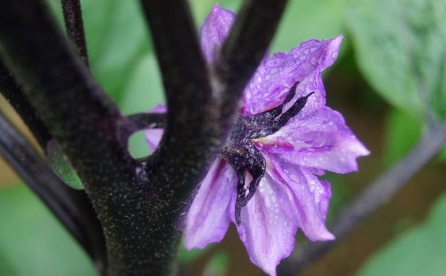 比起倭瓜花、葫芦花和黄瓜花来,淡紫色的茄子花很不扎眼。它藏在叶片中,倒挂在秧茎上,默默地俯首绽蕾。茄子花就象豆角花一样,不撒谎,打雷就下雨,开花就结果。不像倭瓜花、葫芦花和黄瓜花们,张张扬扬的,撒谎撩屁的,让人看到花开喜眉头,看到花落心空凉。