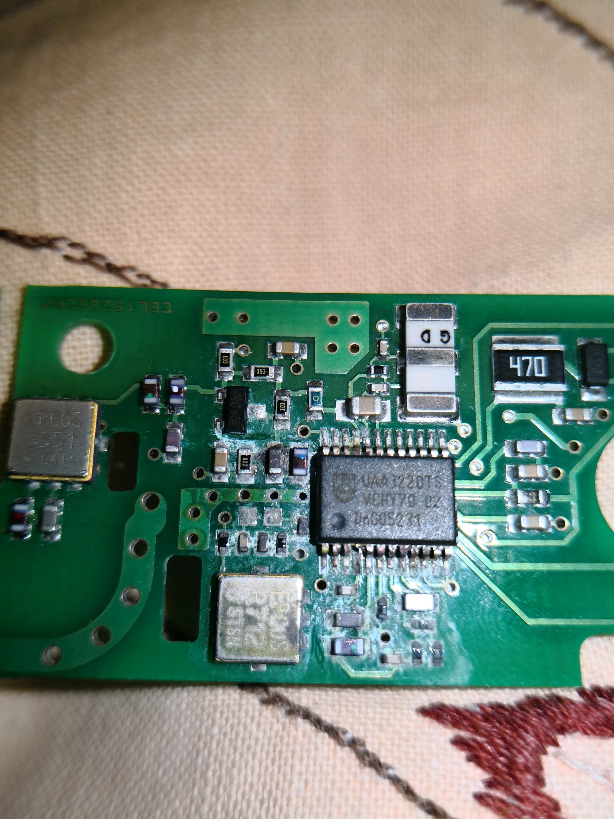 本人05款老MINI开年前段时间遥控器突然失灵换充电电池后也无效后来找到问题所在车内后视镜内射频模块芯片但因为腐蚀严重无法看到损芯片型号特求助家??
