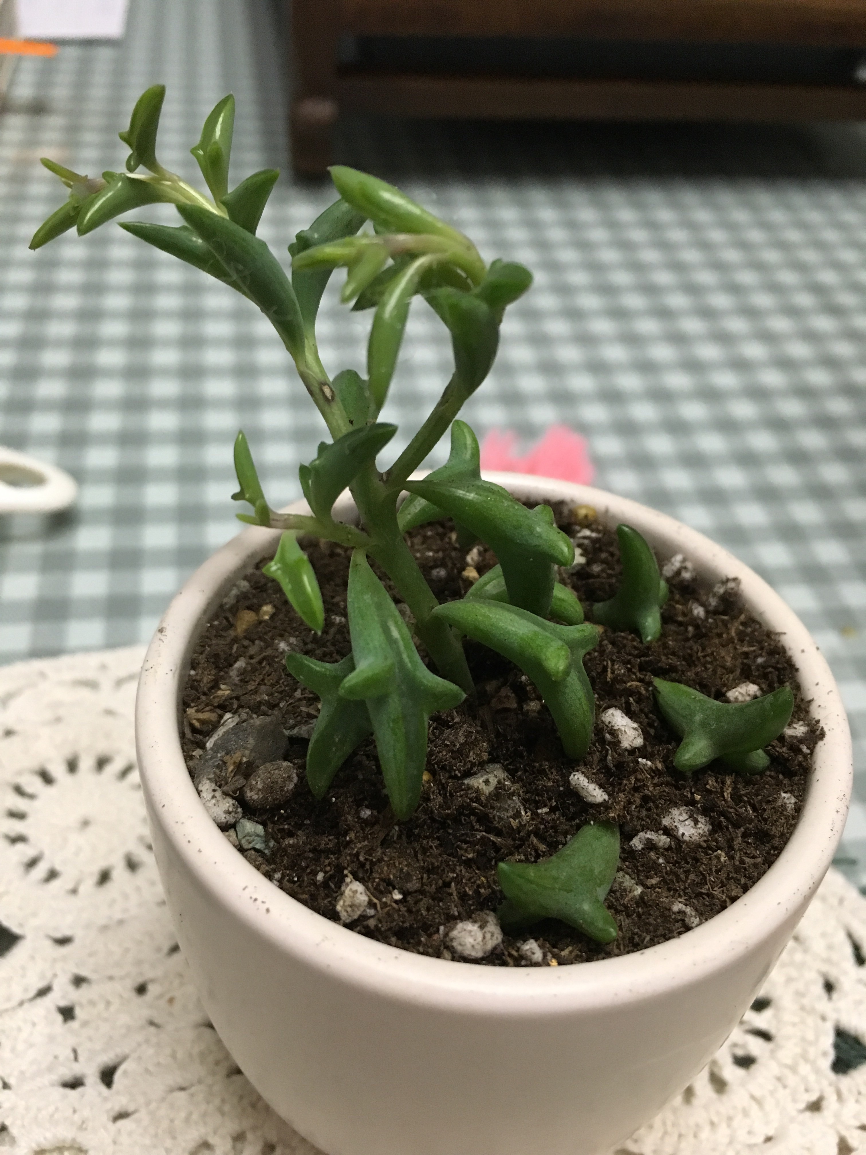 单位送给了会养花的人。后来看有同事养超袖珍小植物,当时还不知是多肉,说能吸甲醛,淘宝有卖。就逛淘宝,一看几毛一种,就一气钩了几十种到包邮价。