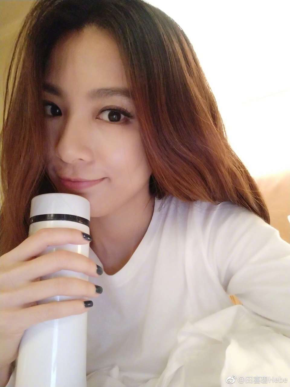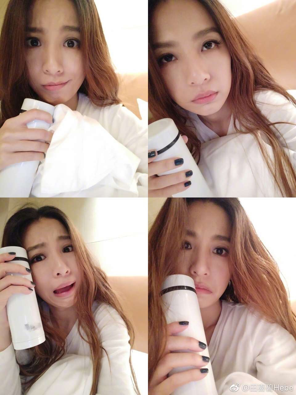 换了“睡衣”呆床上自拍也不先卸妆,maybe是在床上刚视频通讯完哟