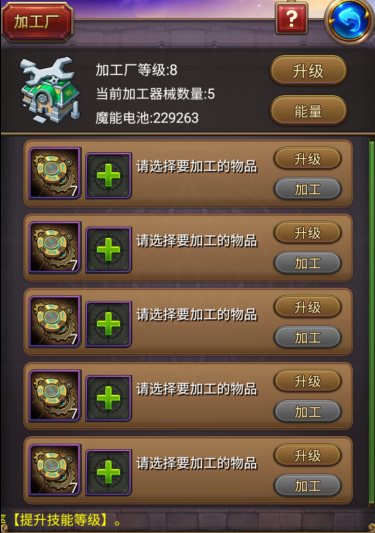 如图,8级加工厂的加工器械数量是5个,目前俊帅的5个加工器械均升级到7级。