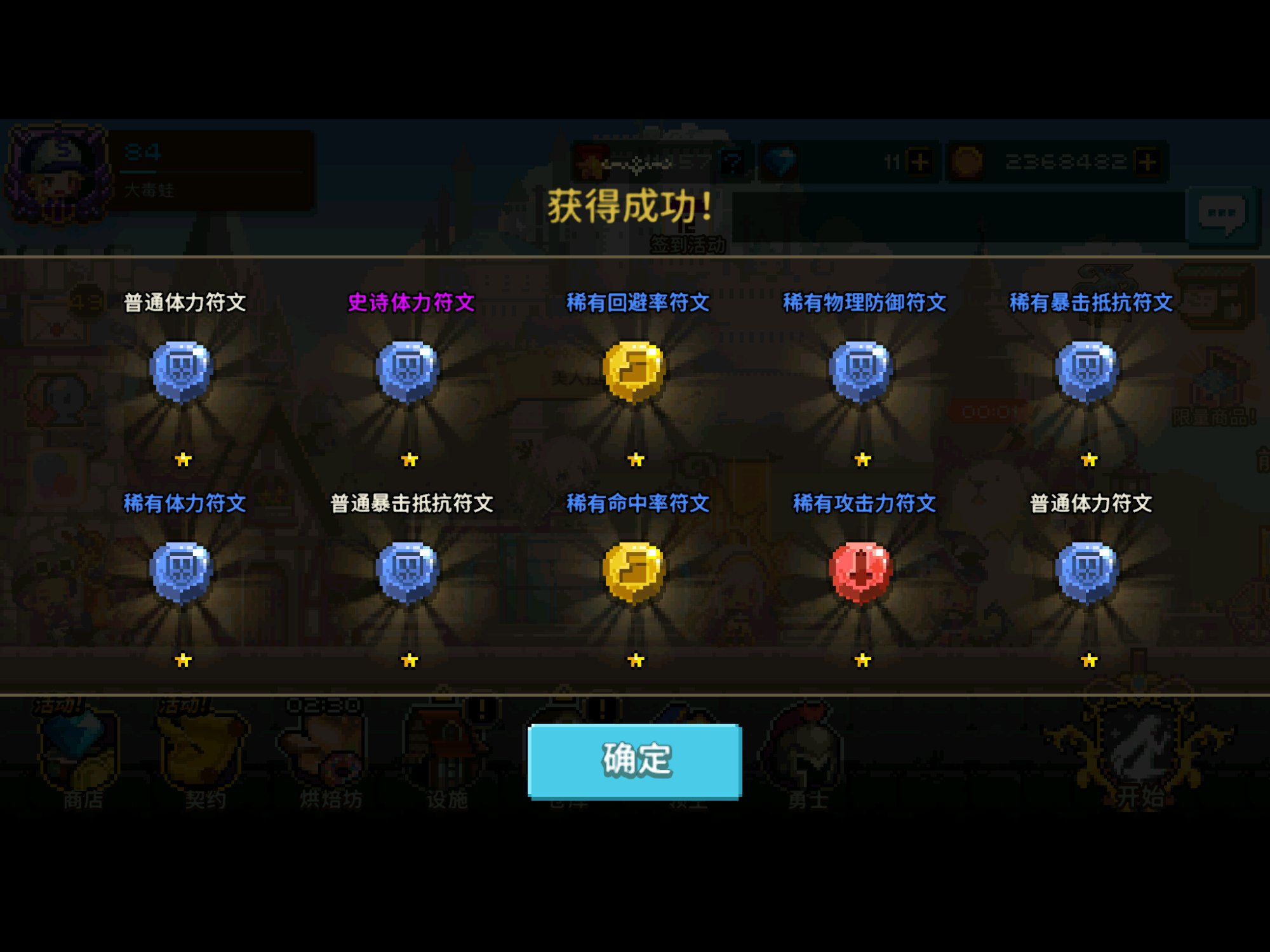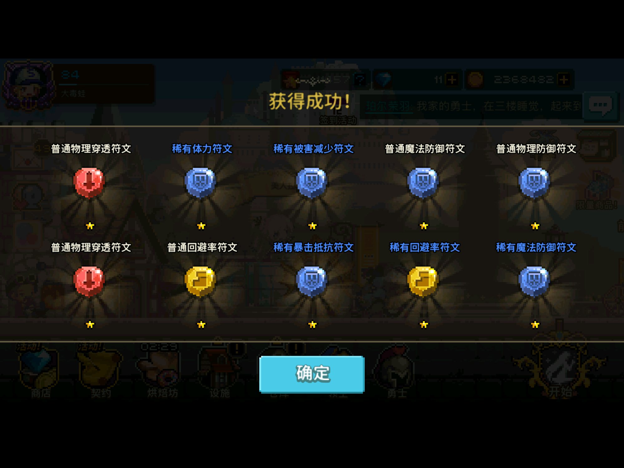 挑战1第一本书是48次的时候掉落,至今没有第二本,稀有体力符文倒是出了不少,大概15个左右,史诗5个,体力魔防爆率各一个抗暴2个;