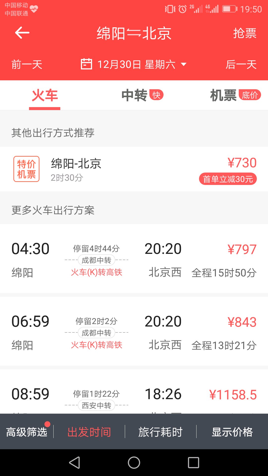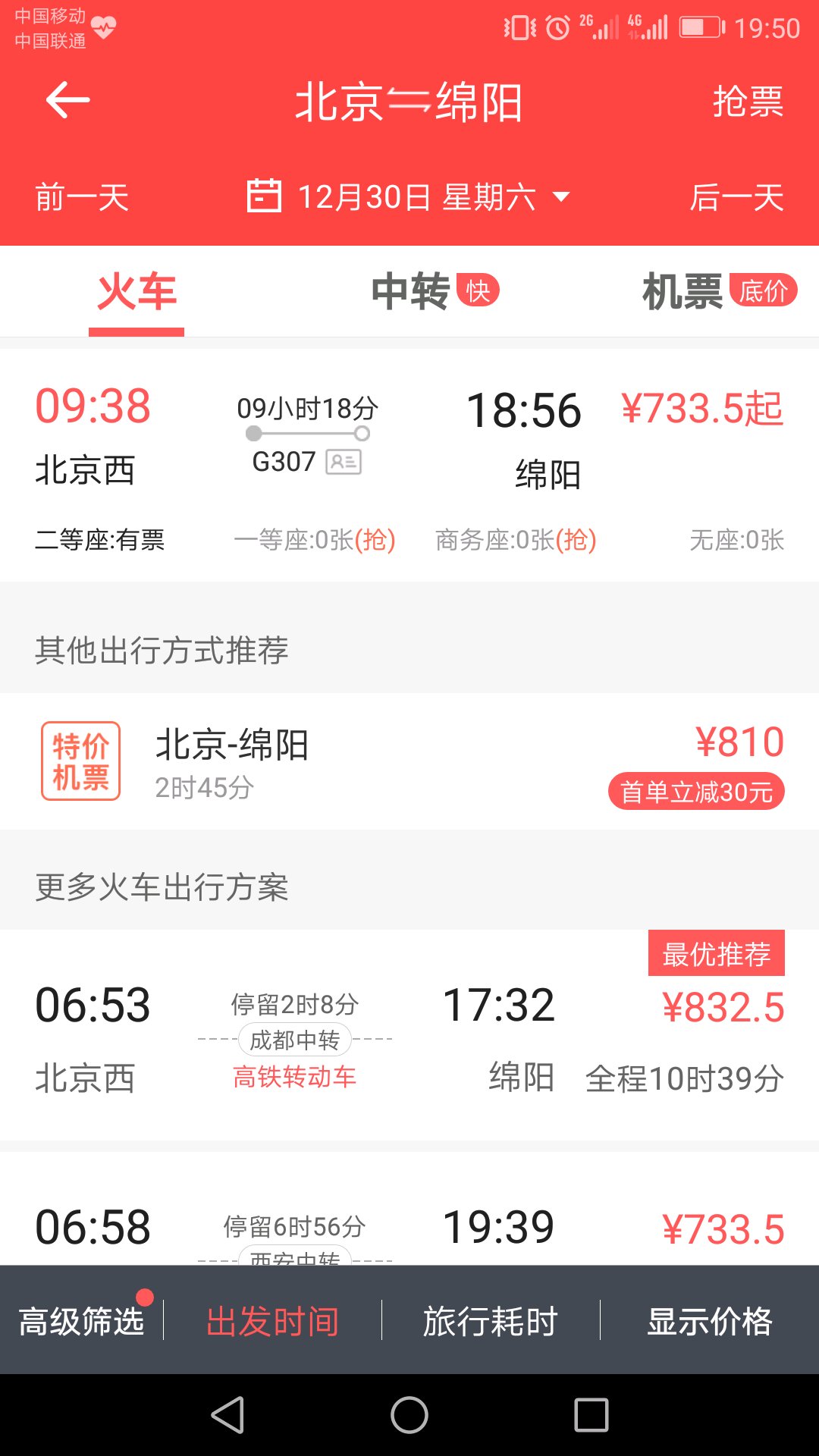截止12月19日,G308还是正在调图中,江油至西安买不到