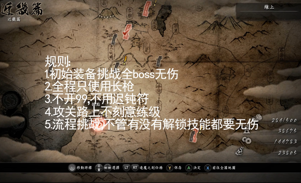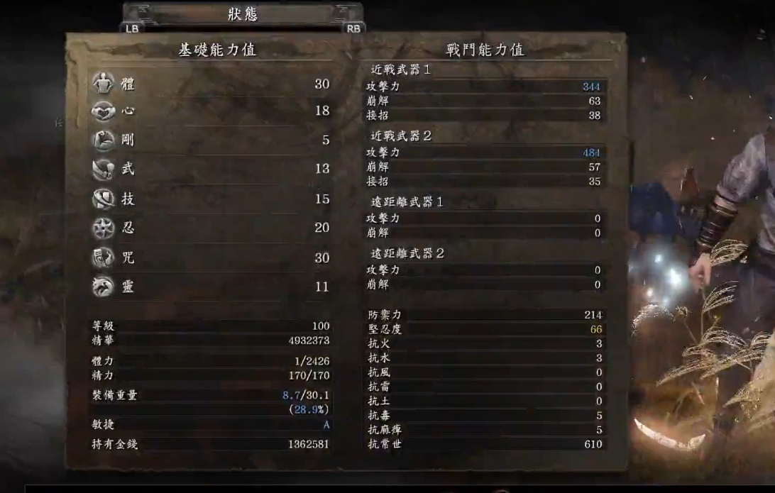 应该不是全部用的初始长枪打的,如果我没看错,打秀赖那里,把他武器打无力化了,而你给出的装备,是没有无力化词条的。