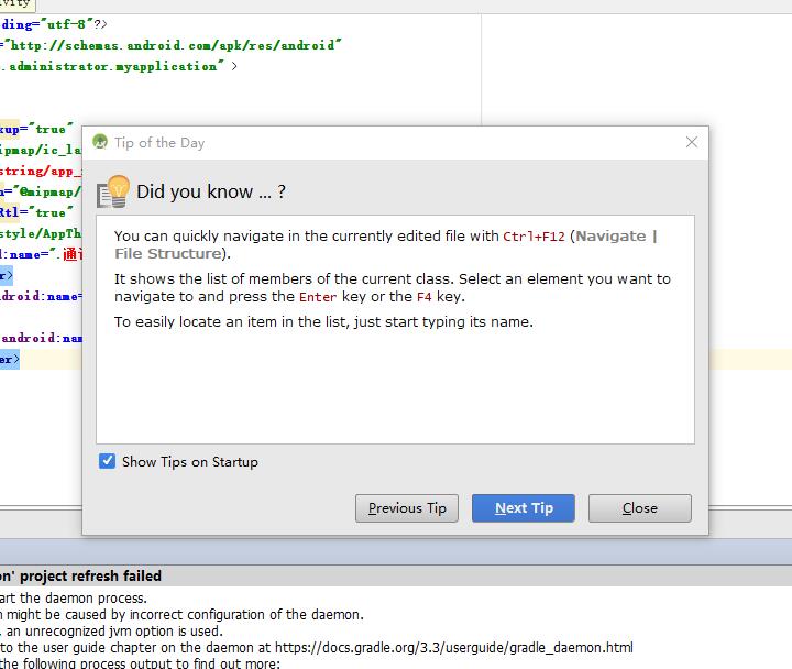 Tip of the day 是每日提醒的意思。这个窗口提醒的内容主要是AS的一些基本资料,例如:一些快捷键的用法、某些功能的介绍。把左下角的勾勾去掉,下一次启动AS就不会提示了。