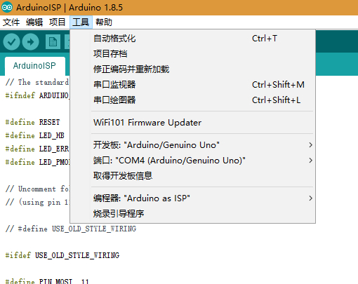 到此,arduino as isp 已制作完成。四,使用arduino as isp烧录新主板的bootloader。