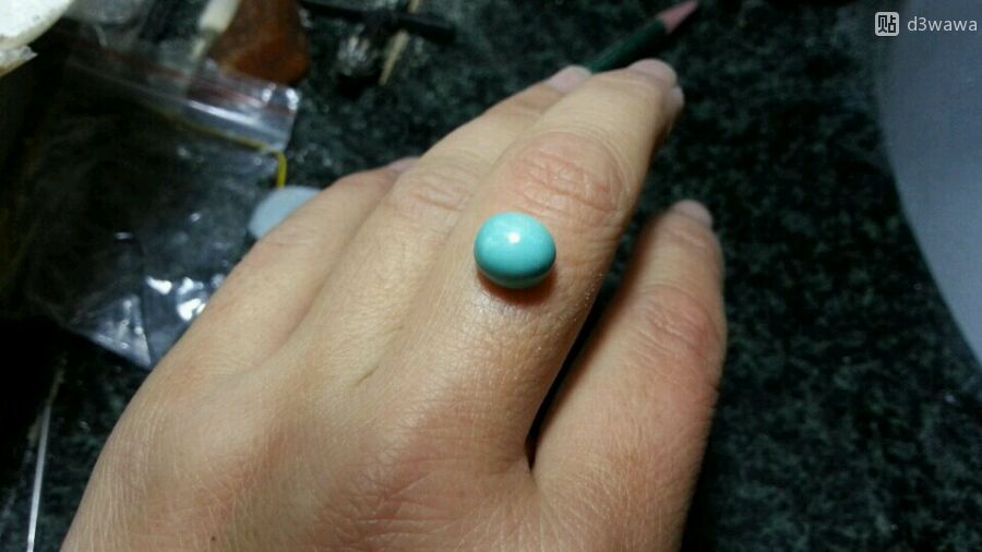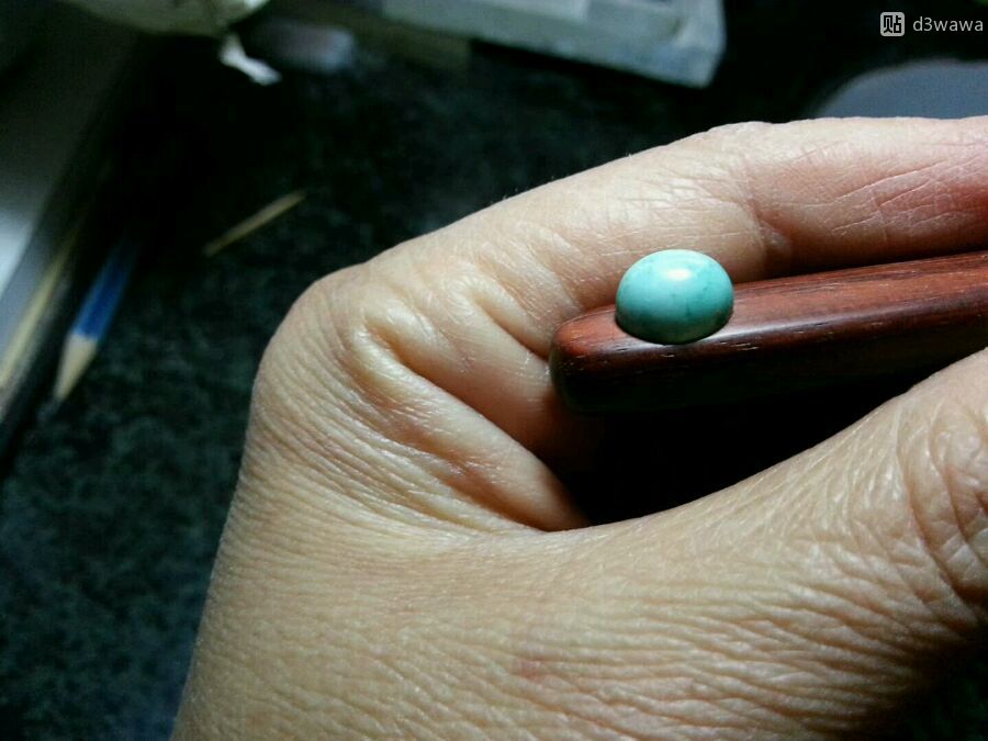 开门见山,我买了2块绿松石的小料,其中一颗做了个戒面。没打磨之前的料子看不出来有白花,我是用204+金刚砂磨头加水修型打磨的,然后上砂纸抛光。