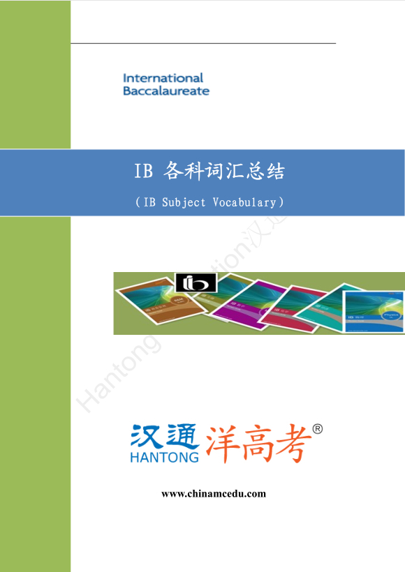 IB词汇手册是由汉通各学科专业老师悉心总结,里面列出了各学科常见的专业词汇。内容根据IB考试大纲所列章节分块总结。中英文对照简明扼要,是学生学习专业课程最好的宝典。
