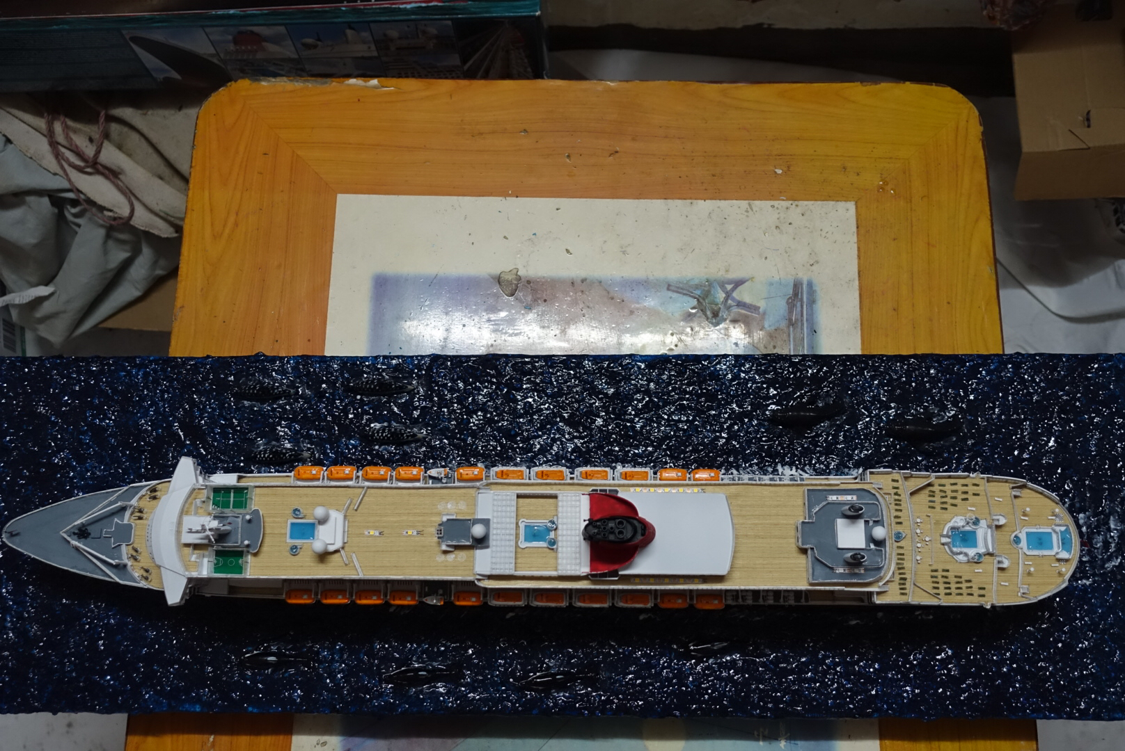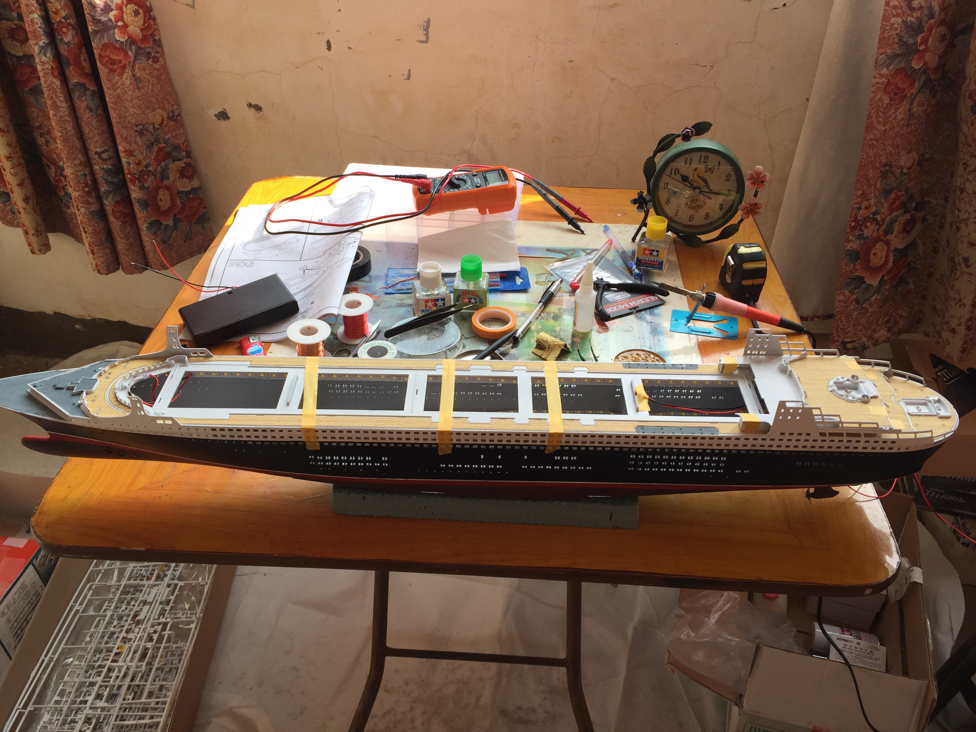 各种零件组合,水贴上船,泳池“灌水”,船体制作完工