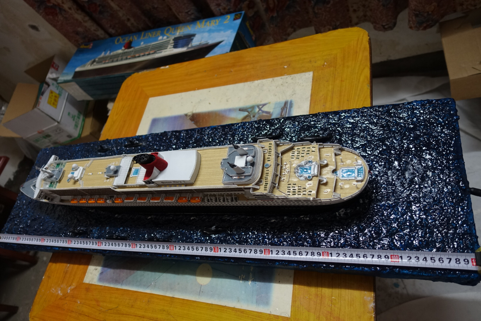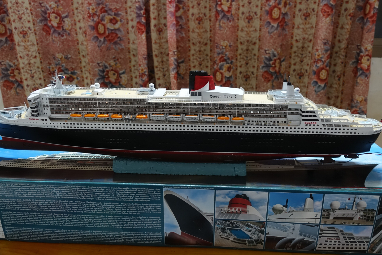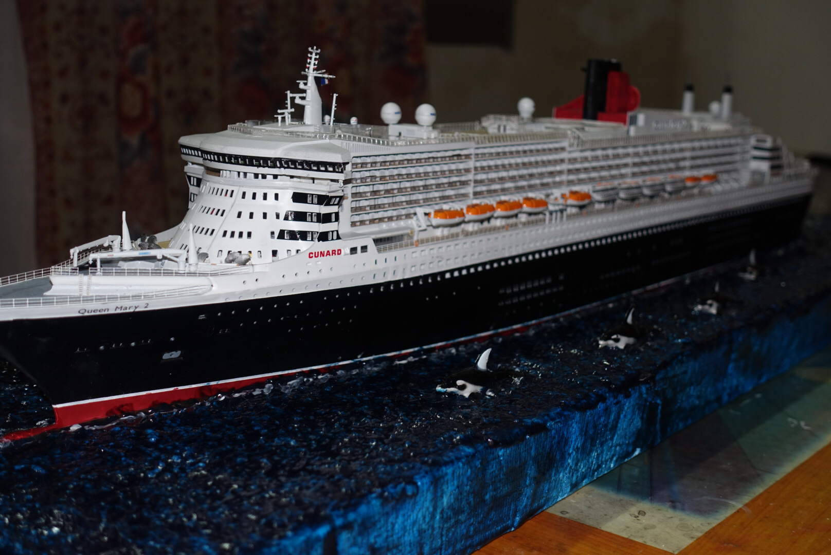 楼主前后花了2个多月时间制作完成玛丽女王2号豪华游轮。船体采用利华1:400板件+冠军蚀刻片+木甲板制作,配备了灯光系统,海景底座。从10月中旬开始制作,终于在平安夜前完工。