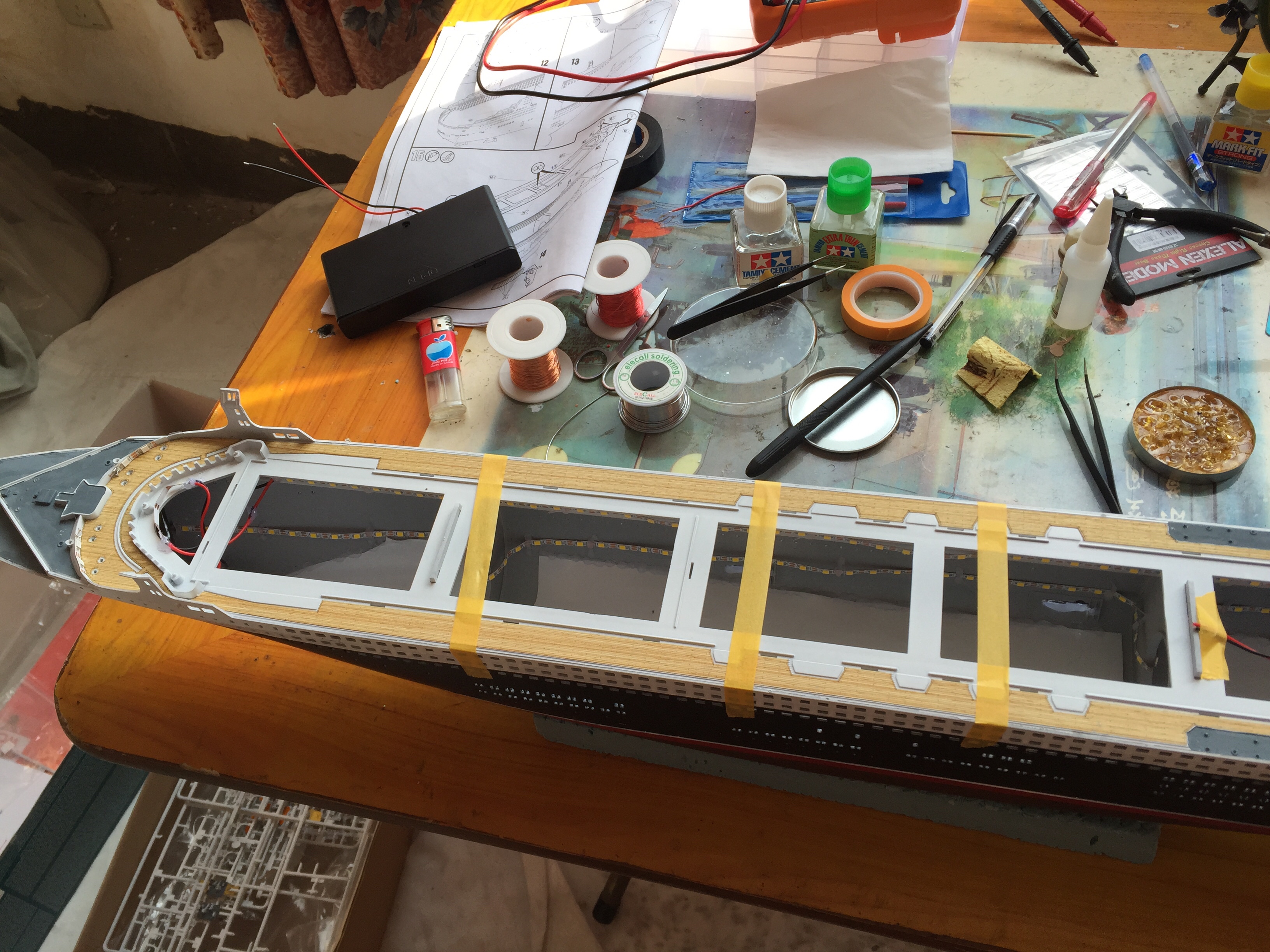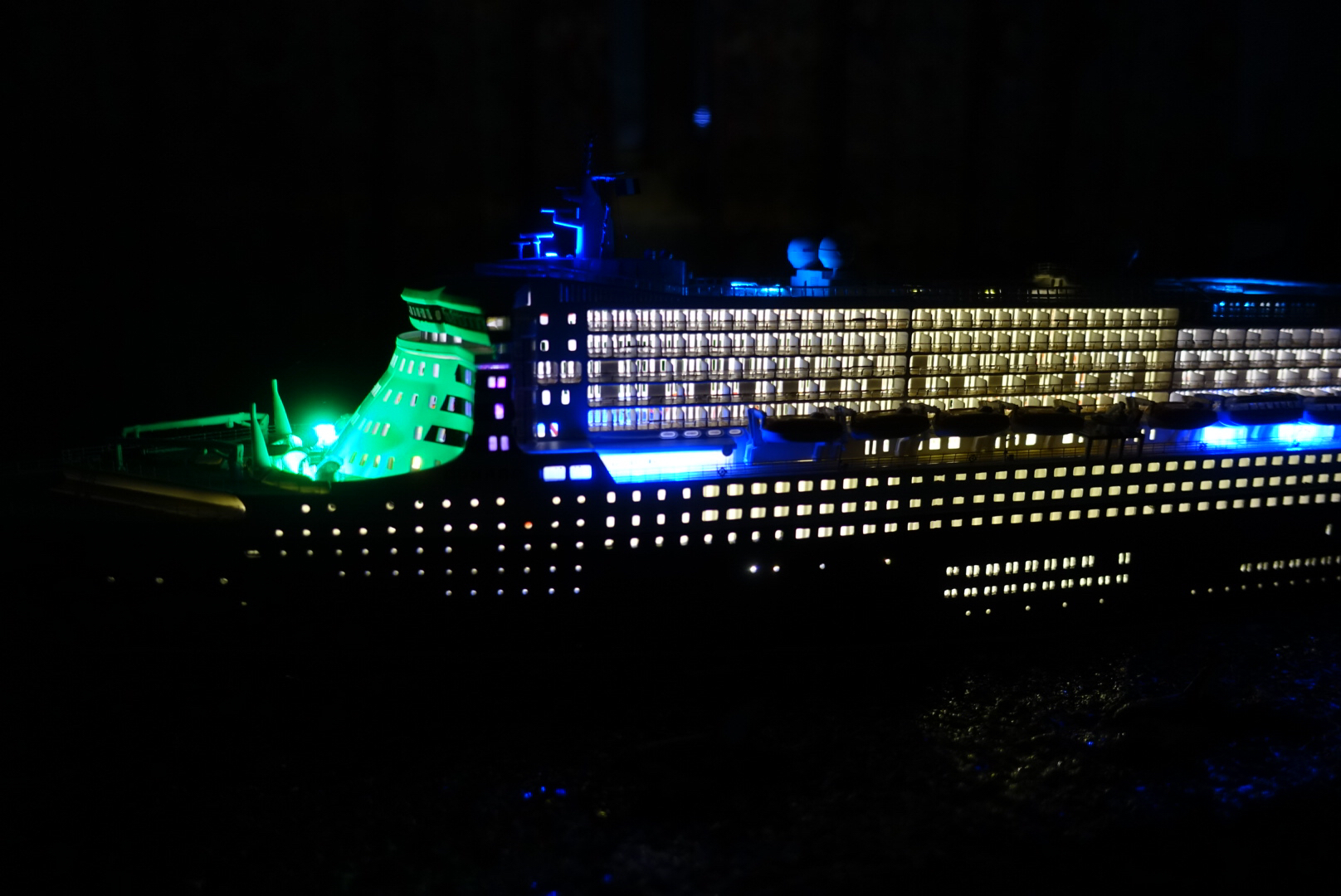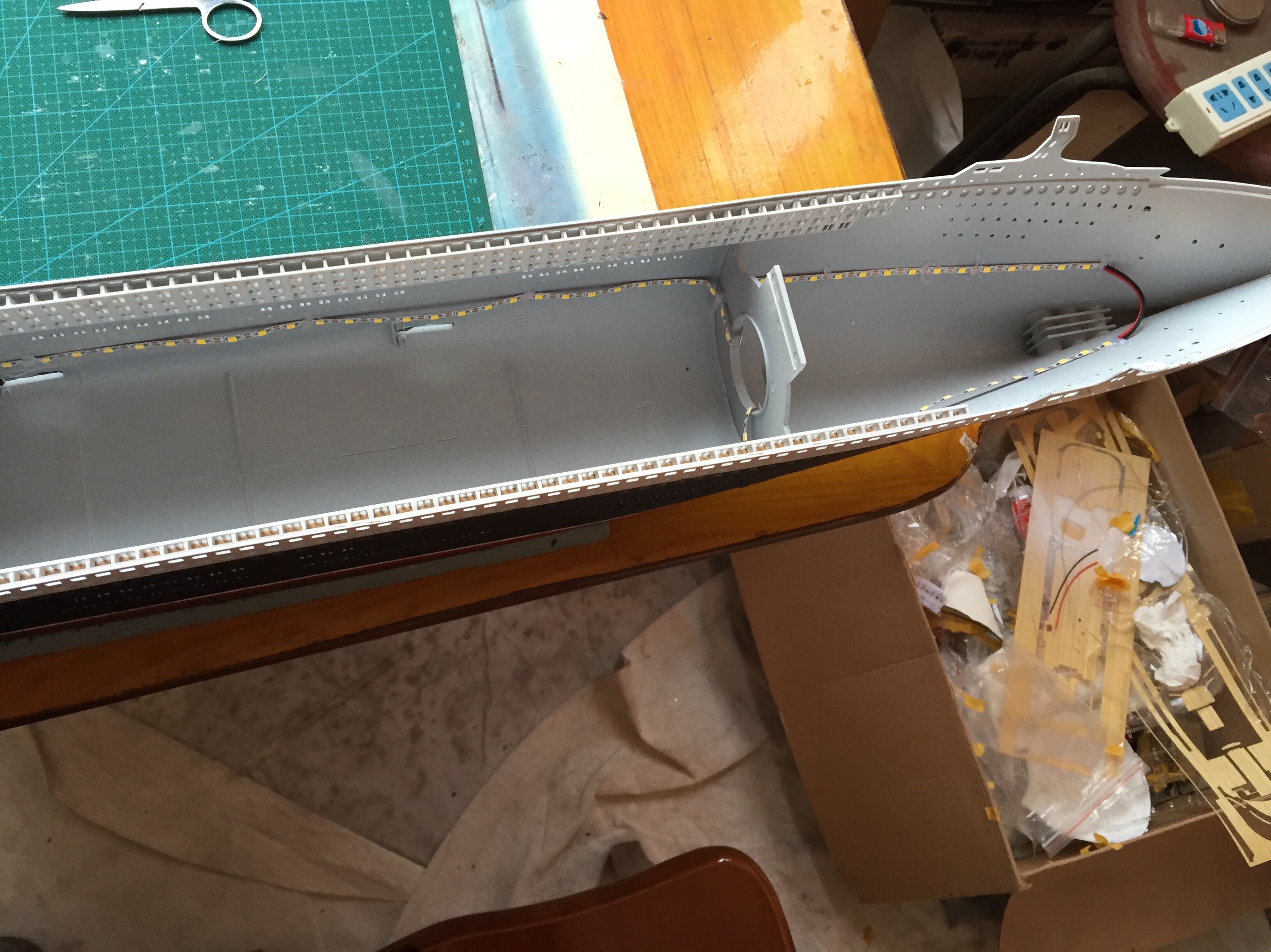 楼主此船甲板没有事先板件做底漆喷涂,所以遮光不好,且采用的是大功率LED,光线太强,容易发热,长期开可能不安全,水景是败笔,最好水景从做。