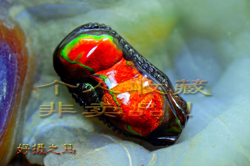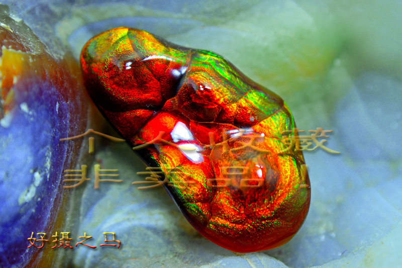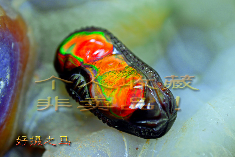 带实际变彩效应的火玛瑙作品真心不多,这是因为在切割和打磨时火彩处理恰到好处才有可能出现的效果,原石上的各个火彩层面要比较‘广’些,青和红色或橙红色的火彩层的品质,结构,结晶要特别良好加上切割师傅的经验均匀的切割和抛光才可能成就一颗能够变彩的火玛瑙。