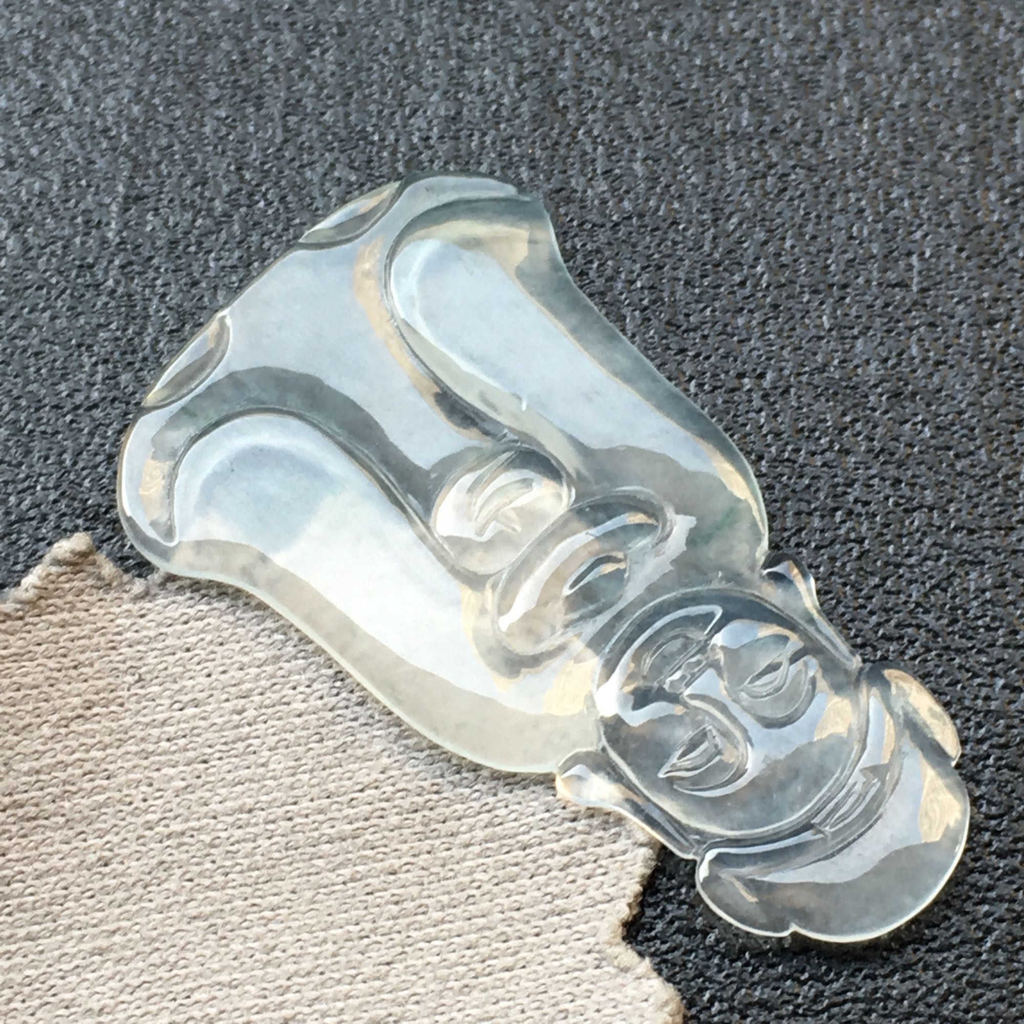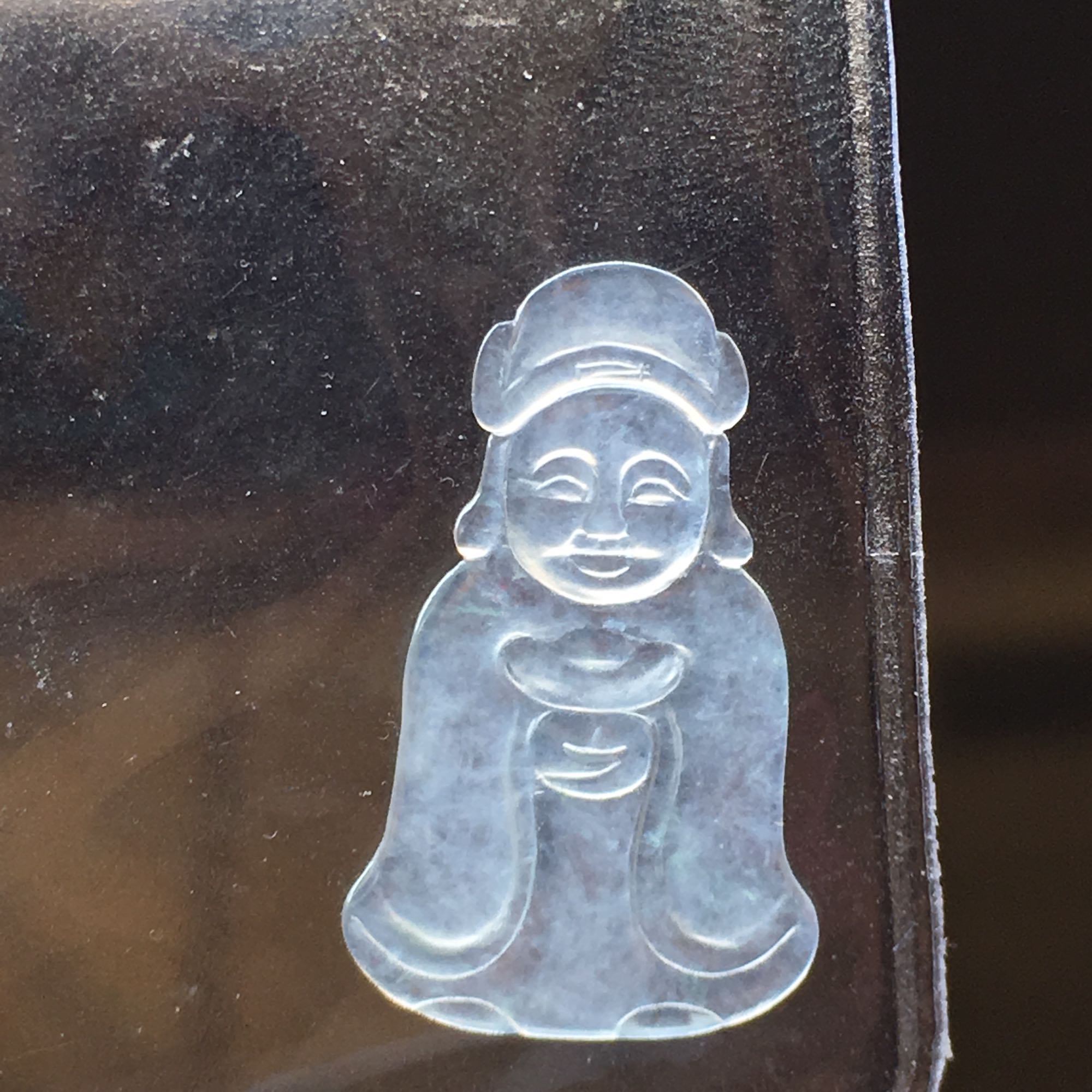 💰💰388,白高冰财神镶件:25.1-15.1-1.5mm,完整,通透如水,水润光滑,质地细腻,镶嵌效果佳