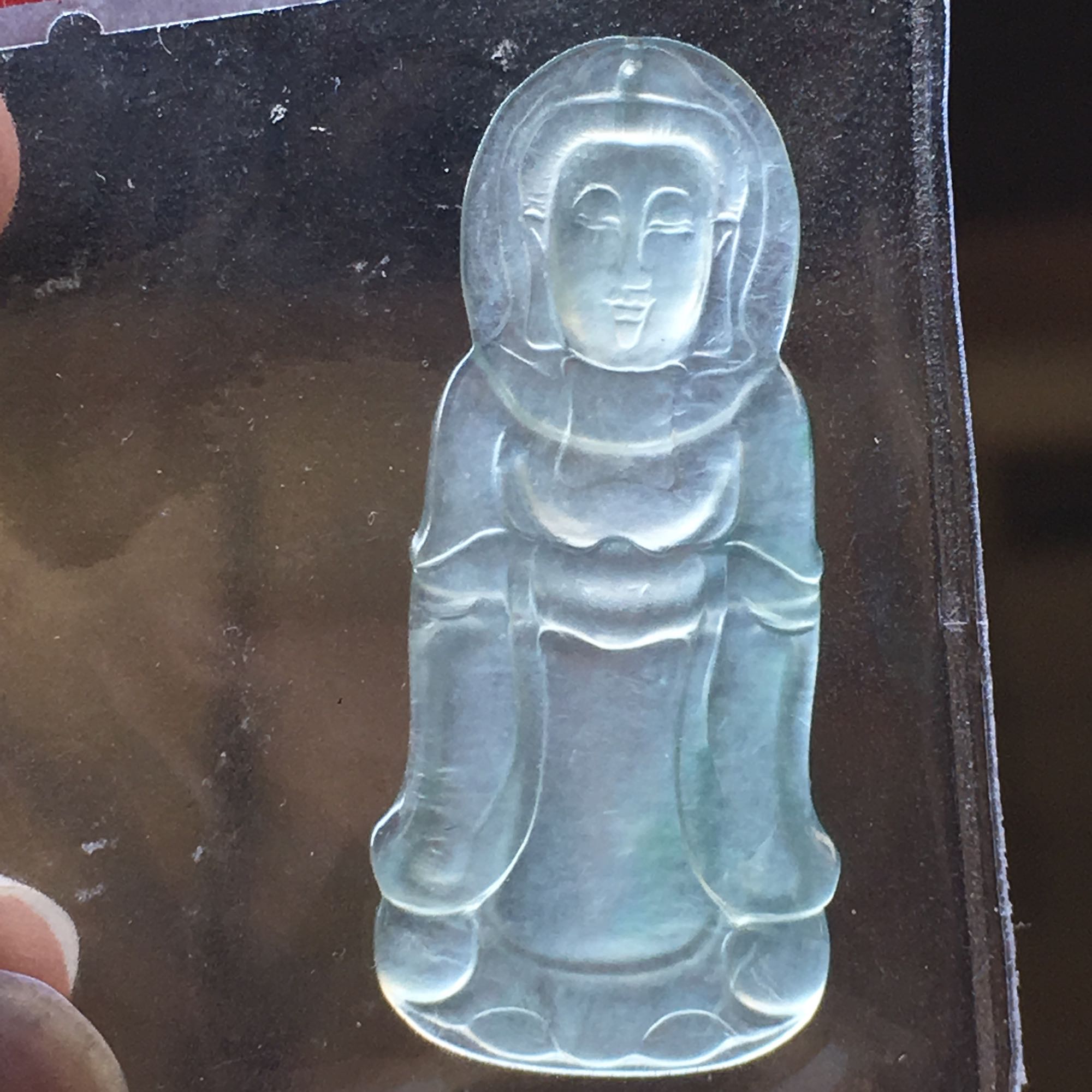 💰💰388,晴水站佛吊坠:26.3-18.4-3.5mm,完美无裂,晴水通透,水润光滑,品相端庄,质地细腻