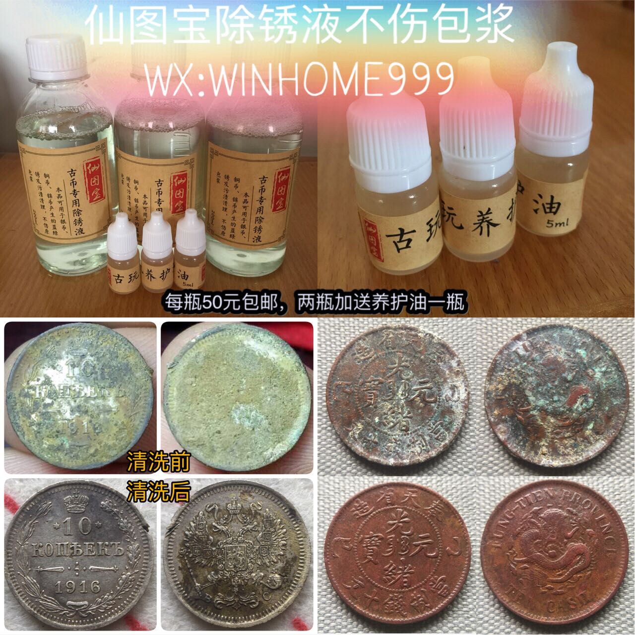 仙图宝除锈液~不伤包浆只除锈,铜元银元除锈的福音。有需要的朋友请联系我微信winhome999