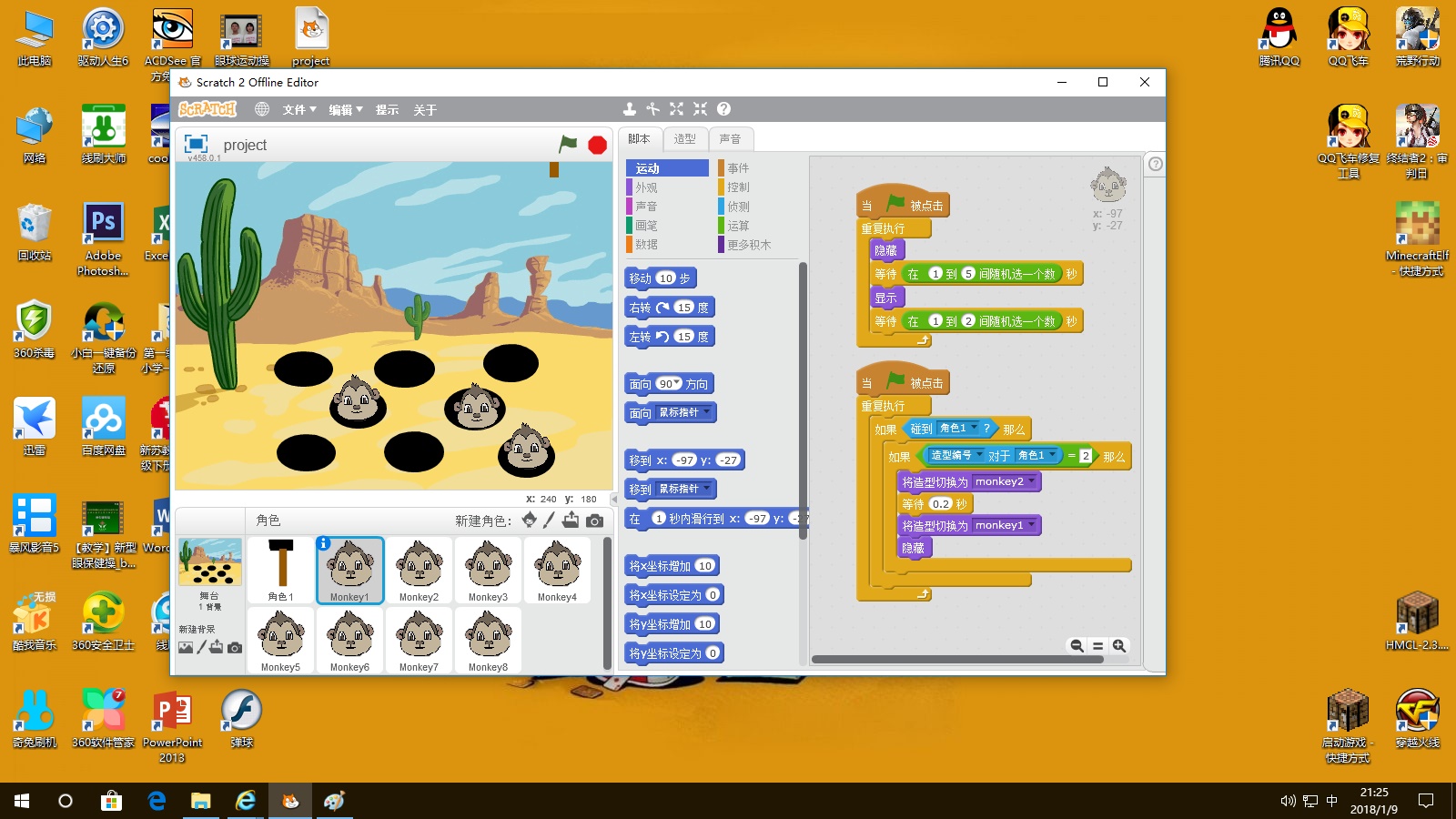 这是因为各个角色会同时执行脚本,比如说一个地鼠正在显示,3秒后隐藏;在它显示时,另一个地鼠出现了,这就造成了多个地鼠同时出现,可以通过同一个角色完成。