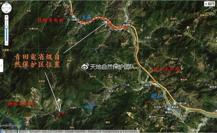 鼋在中国及东南亚分布图。(图片来自IUCN)2017年11月中旬,天地自然保护团队志愿者悄然来到青田县城,首先前往距离县城6公里左右的湖边村了解情况。湖边村是2000年12月12日经浙江省人民政府《关于建立浙江省青田县鼋省级自然保护区的批复》建立了中国唯一的省级鼋保护区――青田鼋省级自然保护区的所在地,当时保护区的面积是360公顷左右。到达这里感觉尘土飞扬,狭窄的河道不仅有普通公路桥、高速公路桥、铁路桥飞架,而且河边正在修建楼房,最惊奇的是瓯江上有一座很大的拦河坝,原来是三溪口水电站。