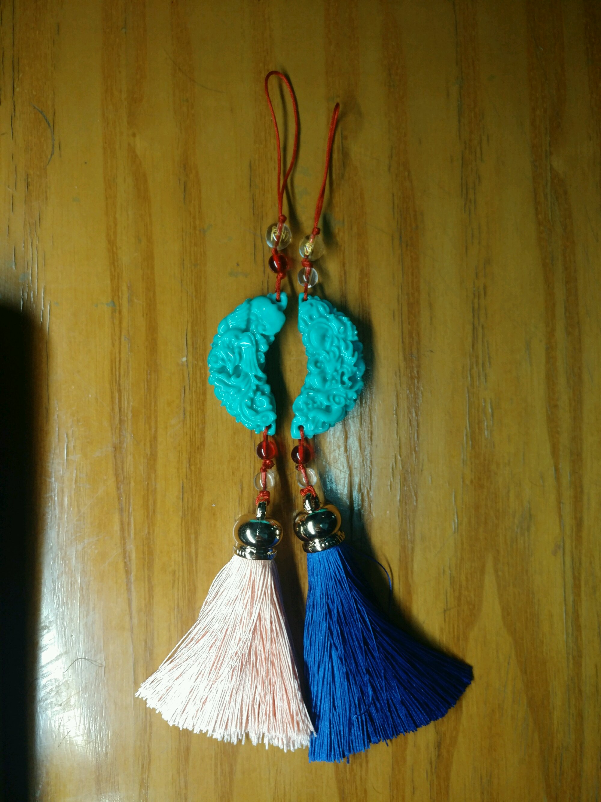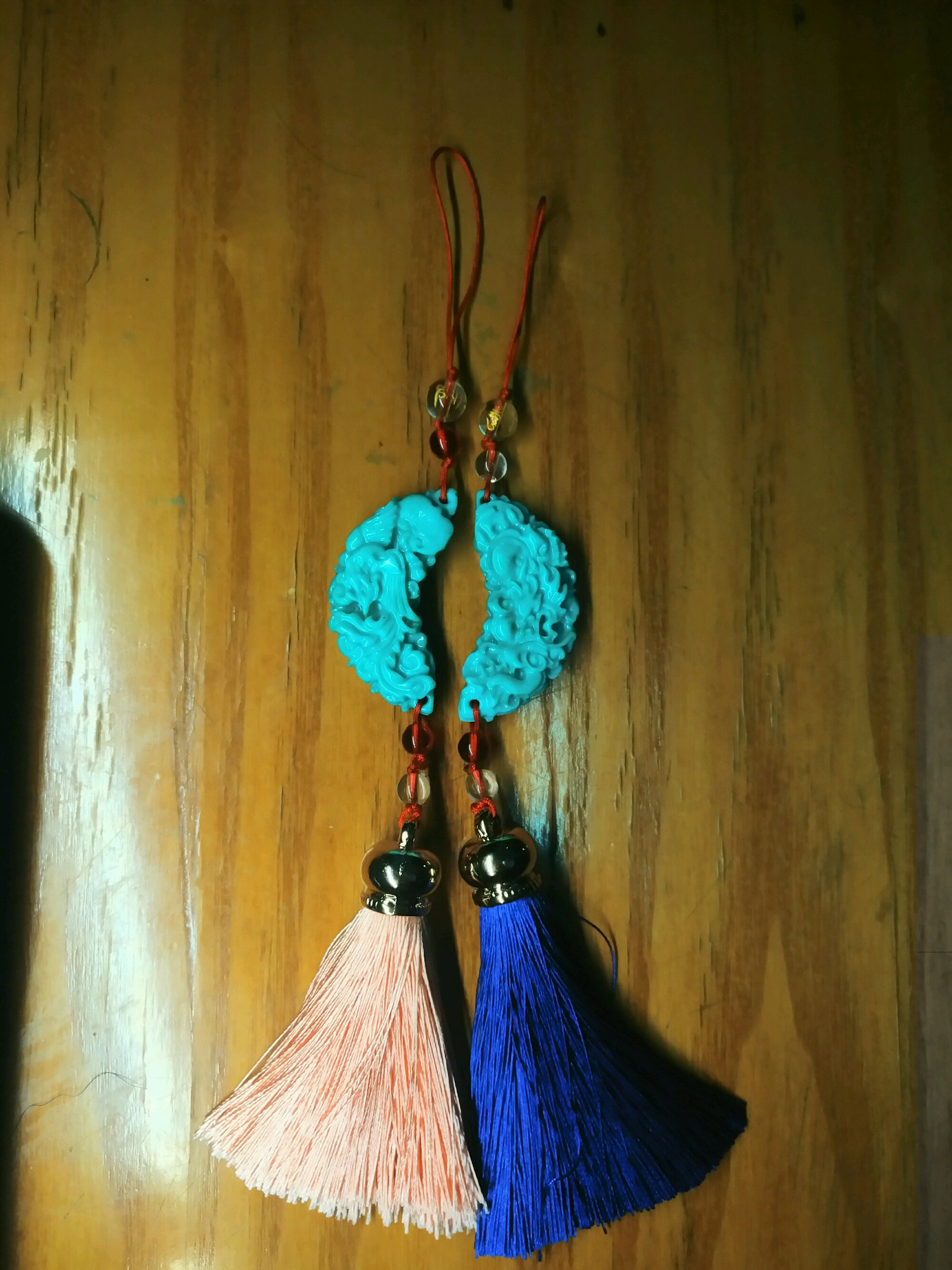 流苏用的她喜欢的颜色,珠子上刻的六字真言,背上刻了我们两个的名字,夜里会发出红色荧光。