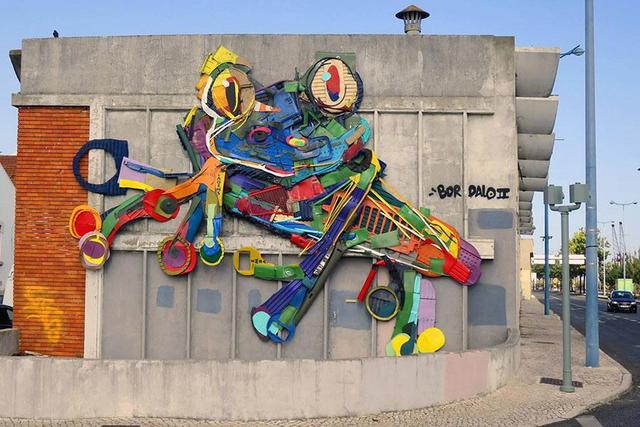 Bordalo专门在里斯本街上搜集大家不要的垃圾,从塑胶板、旧轮胎、木瓦,到纠结在一起的电线和其他废旧物品创作出一系列的3D作品。