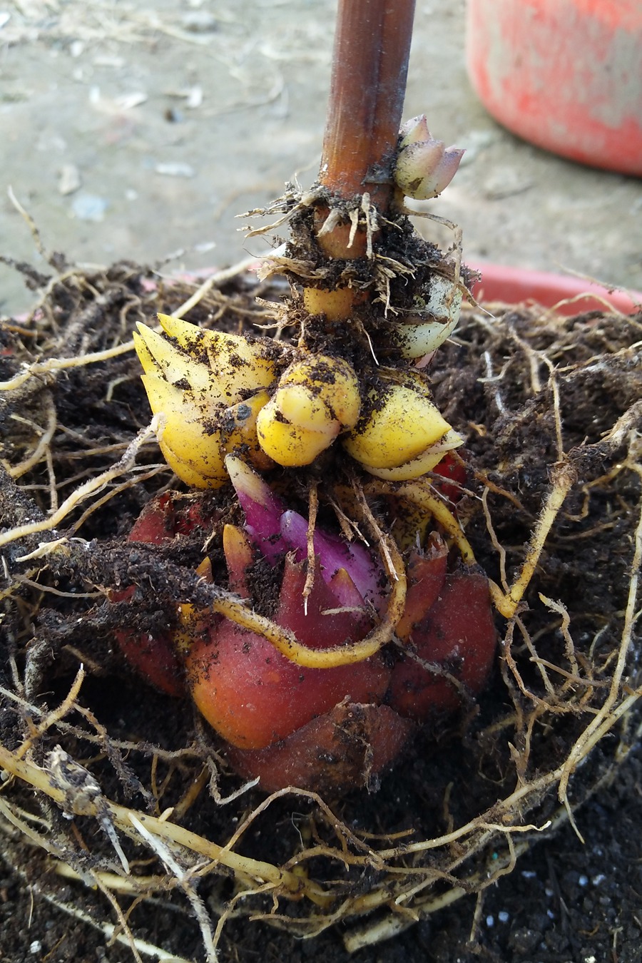 先详细介绍下美素,春天一共种了5棵,有3棵种一盆里的,有单独种一盆的,产仔还是不错的,好几颗生的小球都堵在大球头顶,根系都长到大球鳞片里面了,不翻盆分开不行啊