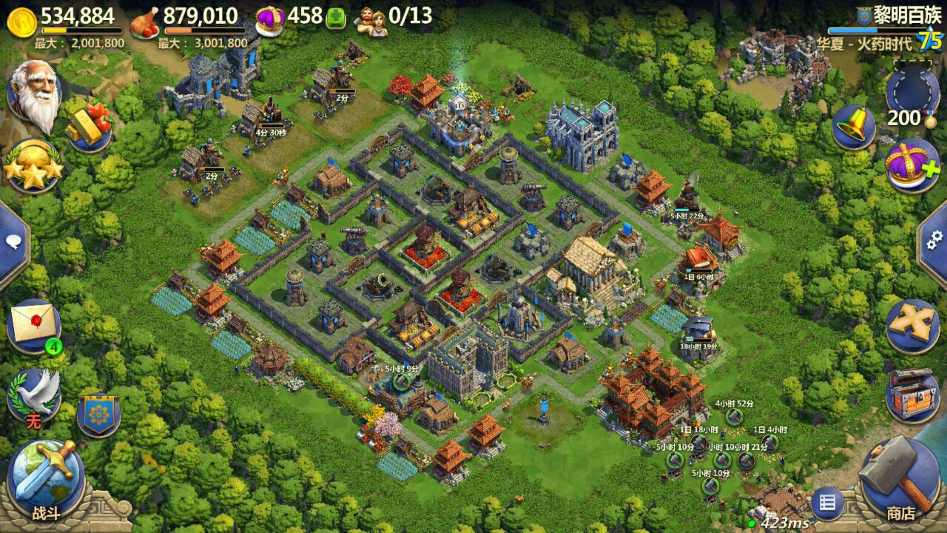 上火药时(把2个投石从1级升级到2级)