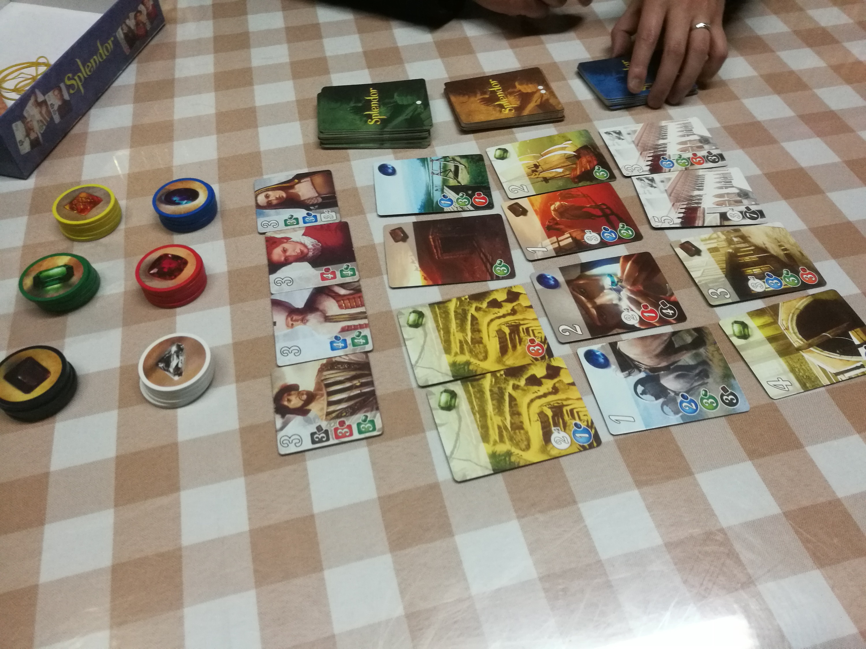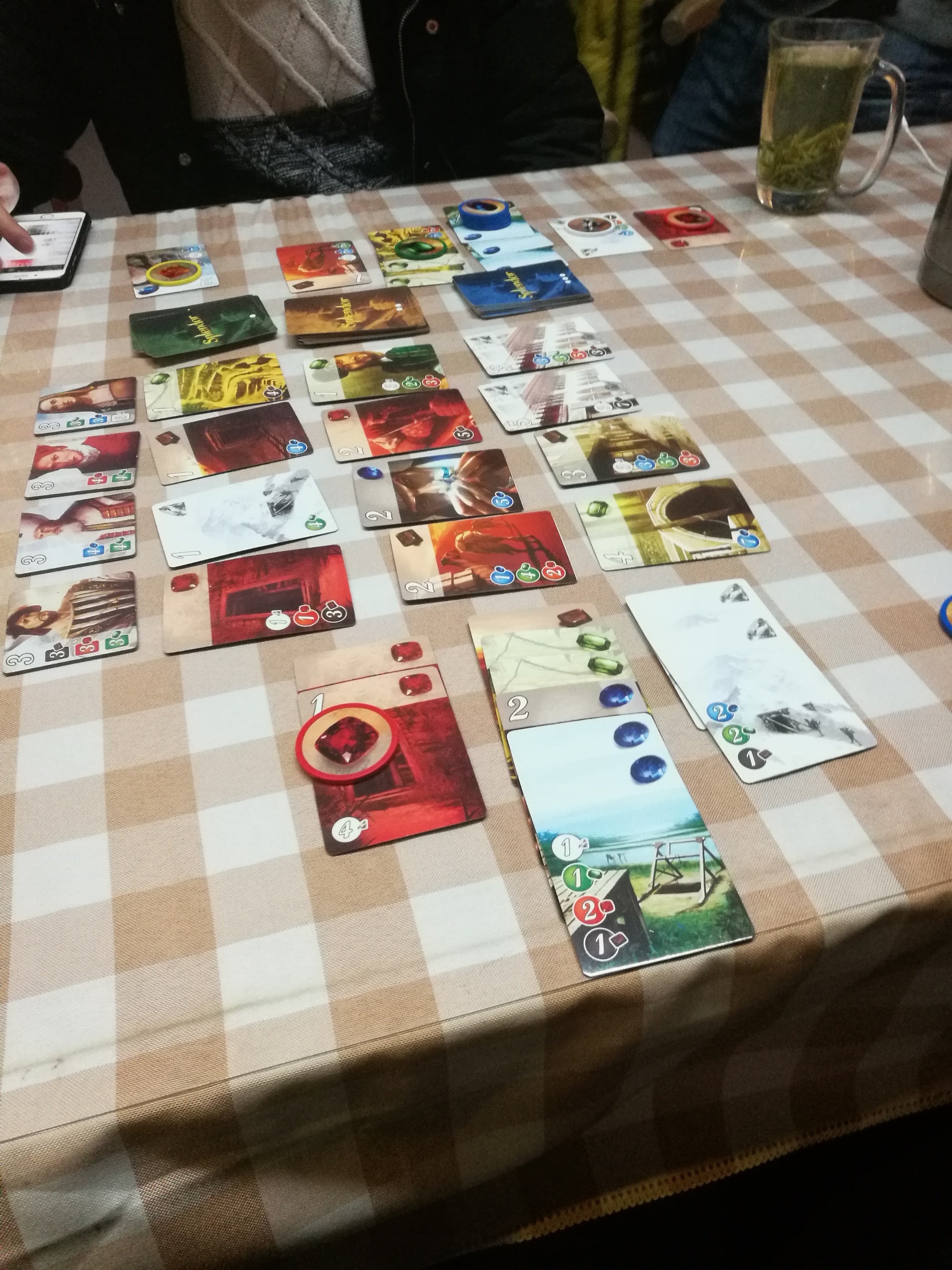 我和土狗刚到,就看见高山兄招牌式的高潮微笑,仿佛在说快来鞭打伦家。桌游地点在一家书吧,很有点骚情调,我们三人就率先开了璀璨宝石暖暖场,高山先手,狂呼到,这个游戏先手优势极大,一副指点江山你们都得跪下的狂妄姿态,璀璨宝石规则就不介绍了,非常简单,但是玩起来可谓唇枪舌剑异常刺激,生生的被我们玩成了嘴炮重策,由于我是末尾玩家,我上靠土狗如春天般含情脉脉,下压高山像寒冬样咄咄逼人,老一辈说的好,拉拢一批无望第一的,打倒一批洋洋得意的。一开始我就针对高山用出伤敌一千自损八百的战术,宁愿自己吃亏只拿2个宝石也要把高山的节奏打乱,然后运用言语攻势对土狗讲清利害关系力争把土狗感化为家狗指哪打哪。在我巧妙的心思下,率先请到了美丽的砖石小姐姐回家。高山也不甘示弱,请了一个彪形大汉回家搞基,靡靡之声不绝于耳。随后的二位宝石达人在我完美限制下都被土狗带回家供奉。当时情况基本都在掌握之中,由于我对高山非法聚集蓝宝石的打压,他的一个二级宝石迟迟没有开工,土狗的宝石大多是一级宝石,异常粗糙,结局就很显然,我暗中观察悄悄发展浑身解数终得第一,领先高山土狗1分之多,一局玩罢,大汗淋漓真是过瘾,愿大家的新的一年如宝石般璀璨。