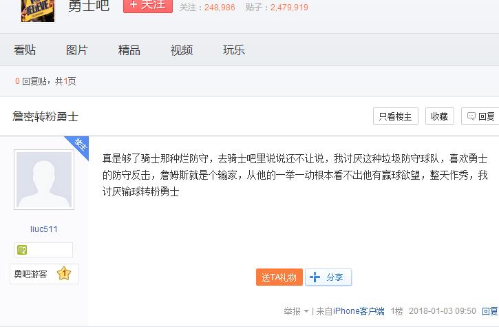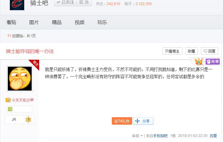 打完半场吧里还是老样子,一片哀嚎,甚至还有说要夺冠就祈祷勇士首发伤几个的,这已经不是正常球迷该有的脑回路了(小吧看到还是把那贴删了吧,明摆着“我是卧底来招黑的”),实在没法看就去隔壁喵了一眼,发现一个流着书包血液的假詹密