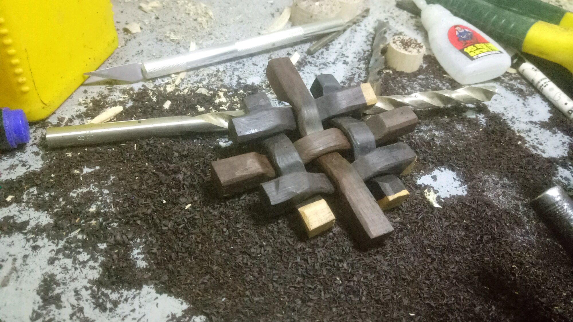 这个吊坠源于看了这个图片而做的,方法是,将一片长方形的檀木片先画好凹处的中心线再切成六条,用木工平铲和圆铲修成凸凹的木棍,然后用砂纸打磨光滑,六根木条紧配合的情况下可以不需胶或其他外力固定,它们自己扭在一起的力量就可以固定成型,但是有点难,我的在打砂纸之前是紧配合的,打完砂就松了,接触点还是点了502