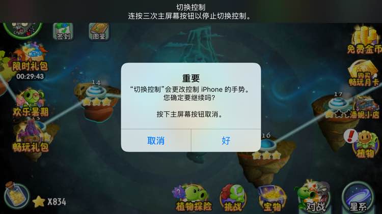 就是这个选择框,每刷20分钟,弹出一次,取消和好,都点不了,点一下还是8秒的手势,只能按home键,再调出切换控制再开始。你狂点屏幕能持续一整夜,我不管狂点多久,出了这个选择框就不能继续了。。。。。。。。。