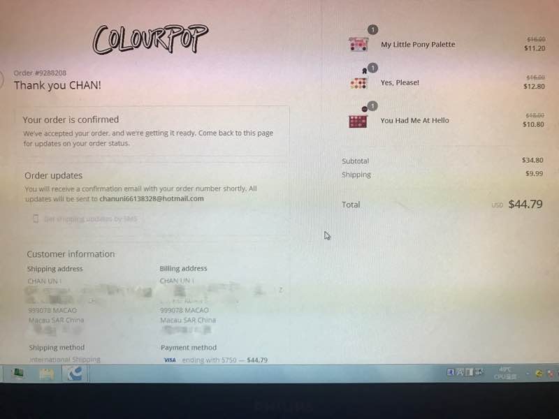 我在colourpop上沒注冊就付款買了
