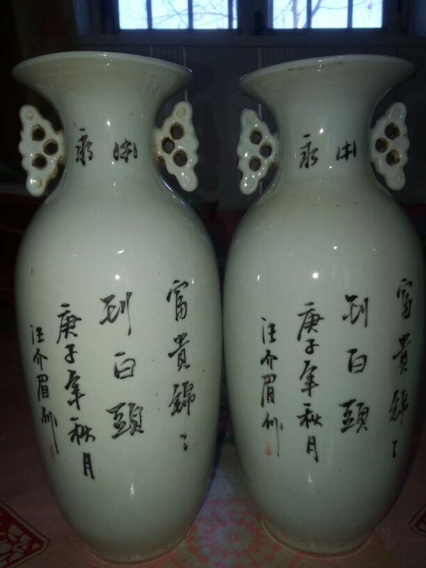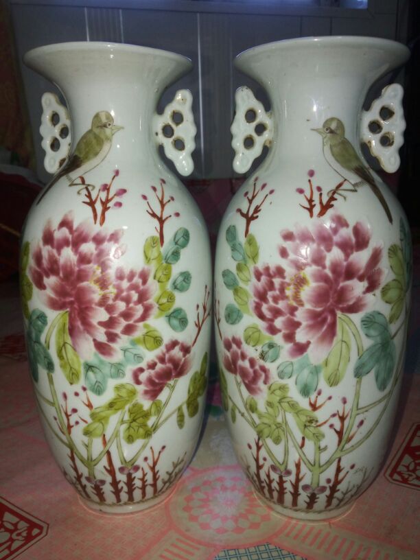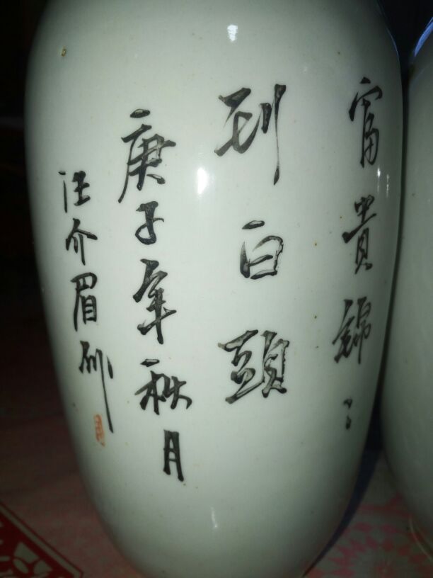 藏友你好,从你发的照片看,这对嫁妆瓶是清末光绪时期汪介眉绘画制作的真品。 画面主题纹饰绘制了白头鹎(亦称白头翁)与牡丹花,藉以表达祝福新婚夫妇富贵长久、白头偕老的美好意愿。 庚子年是1900年,至今已有118年的历史。 汪介眉虽然出身于陶瓷世家,但所制作品基本都为当时民间用器的大路货,加之这类清晚期对瓶的存世量较大,因此市值不是很高。具体到这对大瓶的交易价格,一般在2--3000元左右。