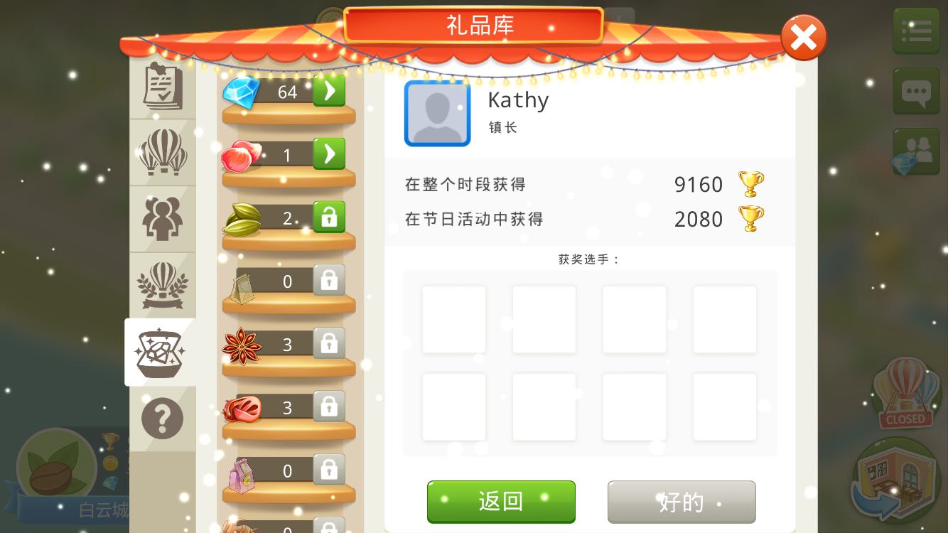 如图,因为小镇是我自己建的,每周活动也就自己在做,现在礼品库里有钻,我想发给我自己,为什么不行呢?