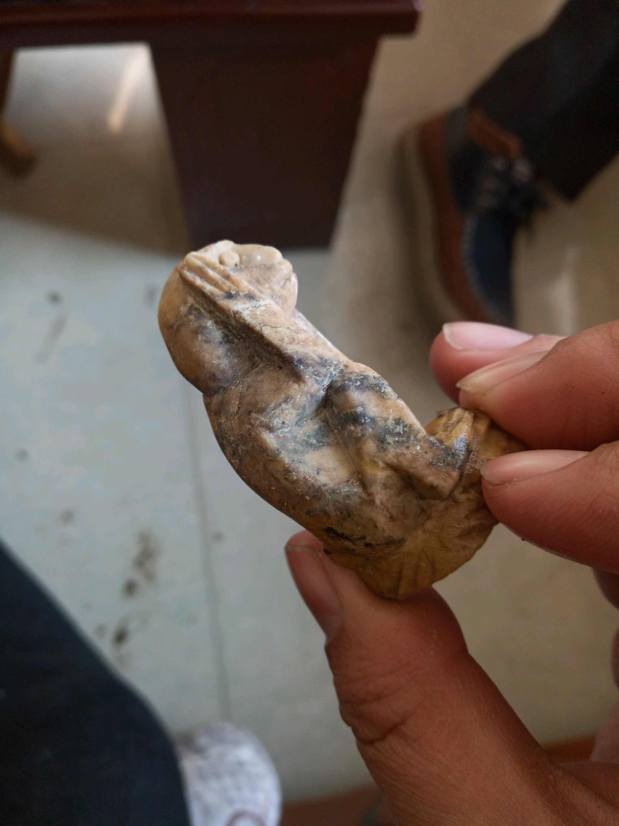 最后补充一下:为什么说他是近代小孩玩意儿呢,因为他这个狗脑下面啊,有个洞洞,这一看就是小孩满串个绳子挂脖子上的。