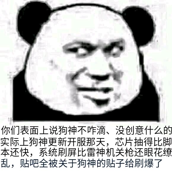 永远都有人找得到喷点,永远都有人不停的喷,发表内心的不爽可以,但是狗神出来那天自己却比谁都激动,每一年等一次的天下第一。。。恐怕是出来的时候嘴里就一边不断的骂着的同时,手里也在操作着天成的充值页面吧。。。![[滑稽]](/static/emoticons/u6ed1u7a3d.png)