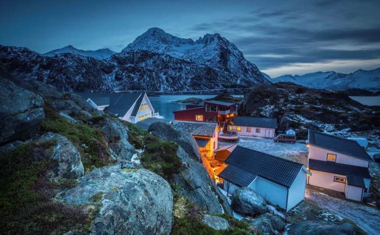 挪威中部的特隆赫姆(Tlondheim),是个小小的城市,从这里坐火车向北穿过北极圈到博德,从博德再乘渡船就可到达对面的罗弗敦群岛。由莫斯肯内斯码头上岸,离码头不到100米的渔屋,这是一些由木柱子架在海边上的红色木房子,有的已有一百多年的历史。罗弗敦一带没有那种有服务员和总台的旅馆,全是清一色的自助式渔民屋。夏季供游人小住,冬天供渔民长租。
